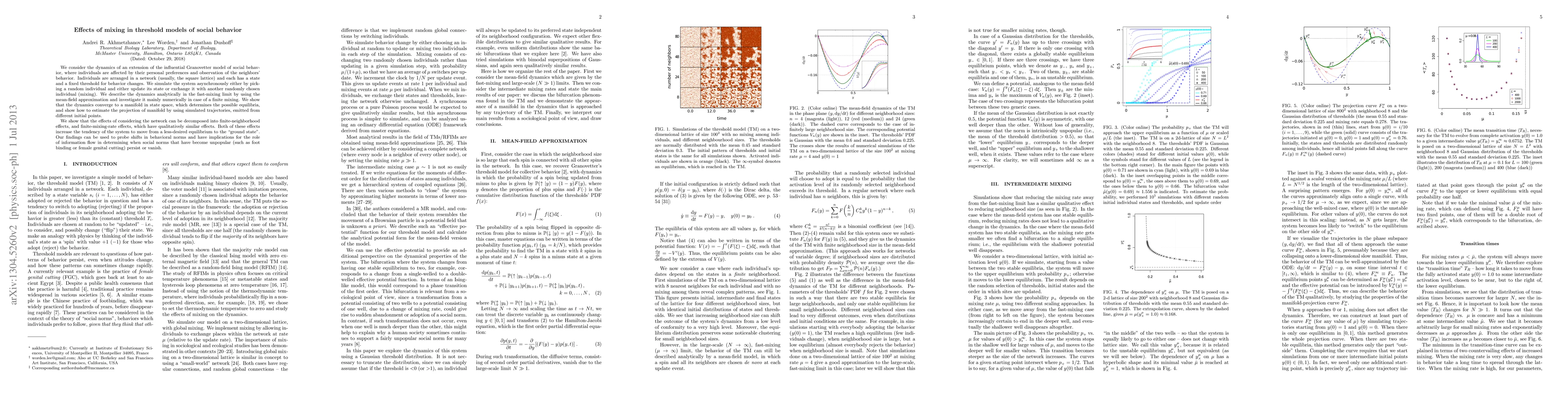 We consider the dynamics of an extension of the influential Granovetter model of social behavior, where individuals are affected by their personal preferences and observation of the neighbors' behavior. Individuals are arranged in a network (usually, the square lattice) and each has a state and a fixed threshold for behavior changes. We simulate the system asynchronously either by picking a random individual and either update its state or exchange it with another randomly chosen individual (mixing). We describe the dynamics analytically in the fast-mixing limit by using the mean-field approximation and investigate it mainly numerically in case of a finite mixing. We show that the dynamics converge to a manifold in state space, which determines the possible equilibria, and show how to estimate the projection of manifold by using simulated trajectories, emitted from different initial points. We show that the effects of considering the network can be decomposed into finite-neighborhood effects, and finite-mixing-rate effects, which have qualitatively similar effects. Both of these effects increase the tendency of the system to move from a less-desired equilibrium to the "ground state". Our findings can be used to probe shifts in behavioral norms and have implications for the role of information flow in determining when social norms that have become unpopular (such as foot binding or female genital cutting) persist or vanish.