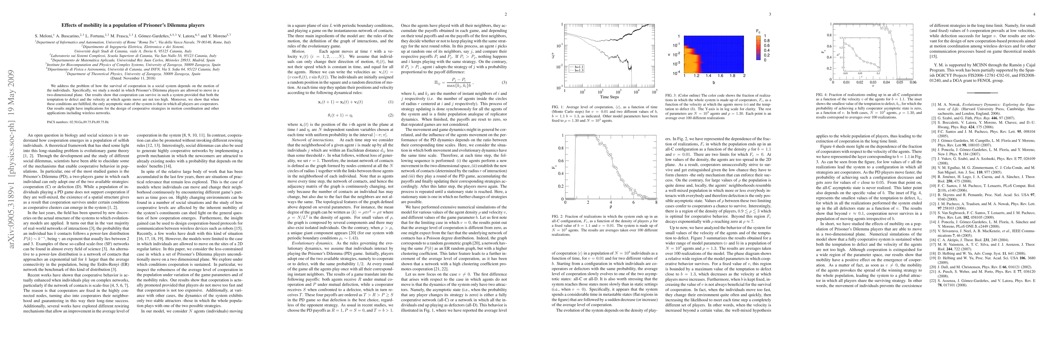 We address the problem of how the survival of cooperation in a social system depends on the motion of the individuals. Specifically, we study a model in which Prisoner's Dilemma players are allowed to move in a two-dimensional plane. Our results show that cooperation can survive in such a system provided that both the temptation to defect and the velocity at which agents move are not too high. Moreover, we show that when these conditions are fulfilled, the only asymptotic state of the system is that in which all players are cooperators. Our results might have implications for the design of cooperative strategies in motion coordination and other applications including wireless networks.