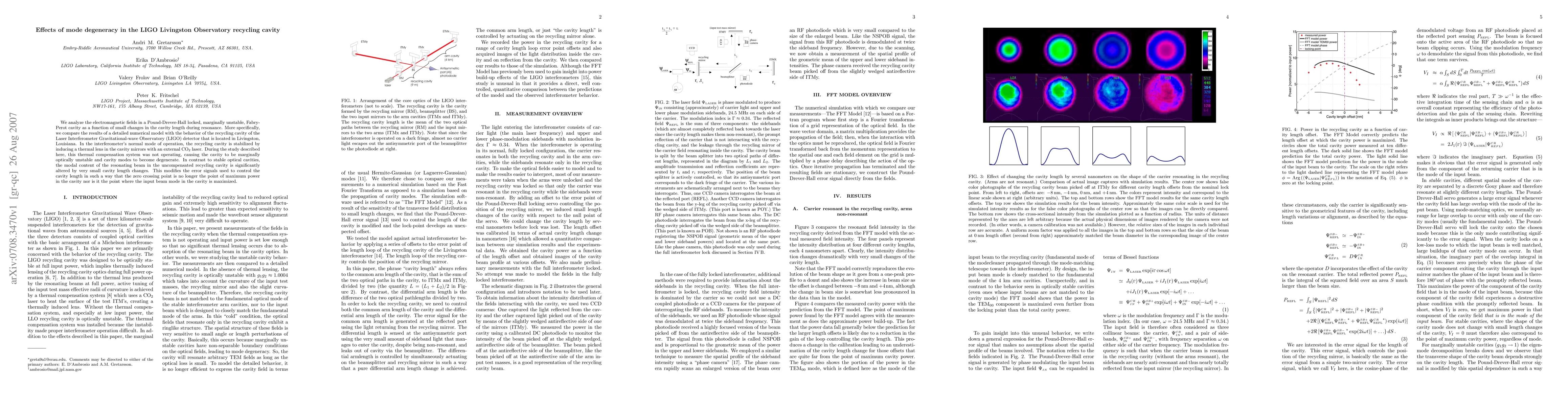We analyze the electromagnetic fields in a Pound-Drever-Hall locked, marginally unstable, Fabry-Perot cavity as a function of small changes in the cavity length during resonance. More specifically, we compare the results of a detailed numerical model with the behavior of the recycling cavity of the Laser Interferometer Gravitational-wave Observatory (LIGO) detector that is located in Livingston, Louisiana. In the interferometer's normal mode of operation, the recycling cavity is stabilized by inducing a thermal lens in the cavity mirrors with an external CO2 laser. During the study described here, this thermal compensation system was not operating, causing the cavity to be marginally optically unstable and cavity modes to become degenerate. In contrast to stable optical cavities, the modal content of the resonating beam in the uncompensated recycling cavity is significantly altered by very small cavity length changes. This modifies the error signals used to control the cavity length in such a way that the zero crossing point is no longer the point of maximum power in the cavity nor is it the point where the input beam mode in the cavity is maximized.