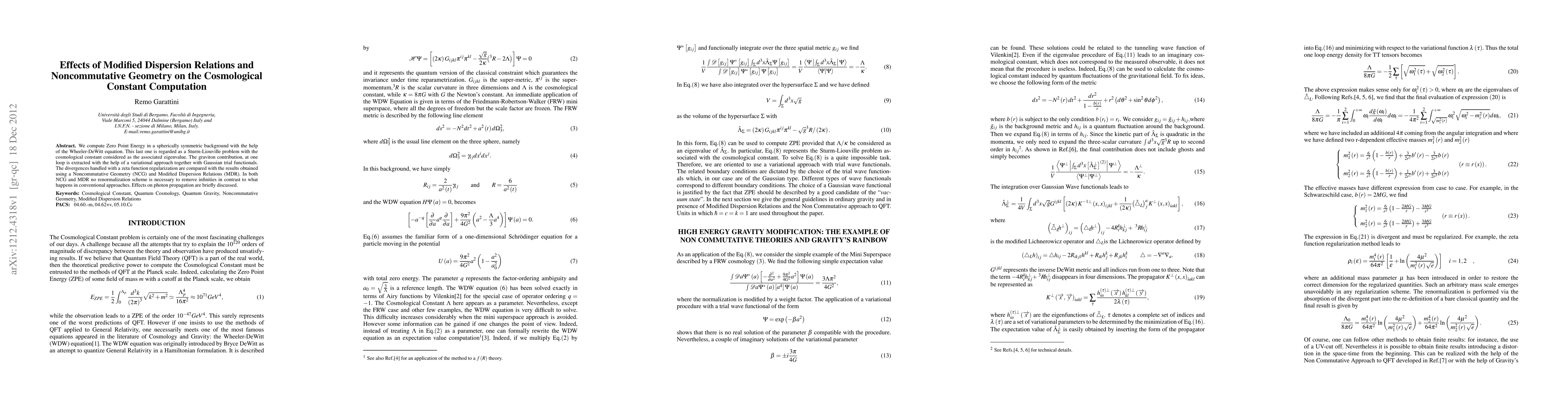 We compute Zero Point Energy in a spherically symmetric background with the help of the Wheeler-DeWitt equation. This last one is regarded as a Sturm-Liouville problem with the cosmological constant considered as the associated eigenvalue. The graviton contribution, at one loop is extracted with the help of a variational approach together with Gaussian trial functionals. The divergences handled with a zeta function regularization are compared with the results obtained using a Noncommutative Geometry (NCG) and Modified Dispersion Relations (MDR). In both NCG and MDR no renormalization scheme is necessary to remove infinities in contrast to what happens in conventional approaches. Effects on photon propagation are briefly discussed.