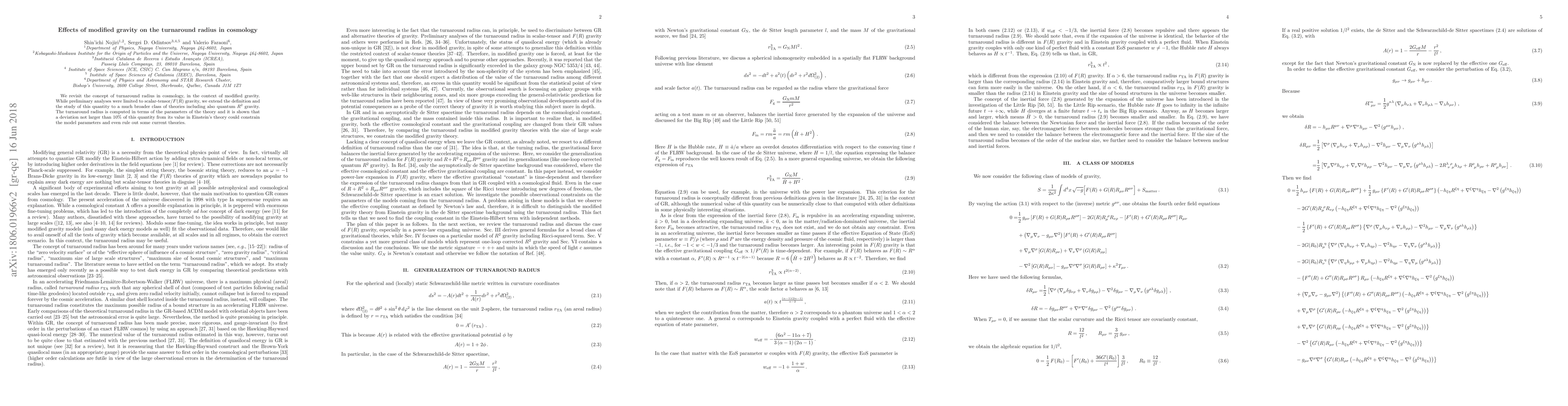 We revisit the concept of turnaround radius in cosmology, in the context of modified gravity. While preliminary analyses were limited to scalar-tensor/$F(R)$ gravity, we extend the definition and the study of this quantity to a much broader class of theories including also quantum $R^2$ gravity. The turnaround radius is computed in terms of the parameters of the theory and it is shown that a deviation not larger than 10\% of this quantity from its value in Einstein's theory could constrain the model parameters and even rule out some current theories.