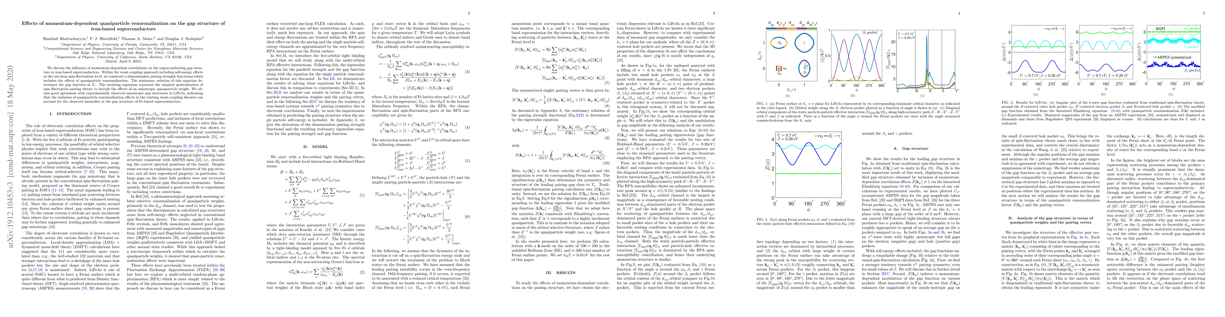 We discuss the influence of momentum-dependent correlations on the superconducting gap structure in iron-based superconductors. Within the weak coupling approach including self-energy effects at the one-loop spin-fluctuation level, we construct a dimensionless pairing strength functional which includes the effects of quasiparticle renormalization. The stationary solution of this equation determines the gap function at $T_c$. The resulting equations represent the simplest generalization of spin fluctuation pairing theory to include the effects of an anisotropic quasiparticle weight. We obtain good agreement with experimentally observed anisotropic gap structures in LiFeAs, indicating that the inclusion of quasiparticle renormalization effects in the existing weak-coupling theories can account for the observed anomalies in the gap structure of Fe-based superconductors.