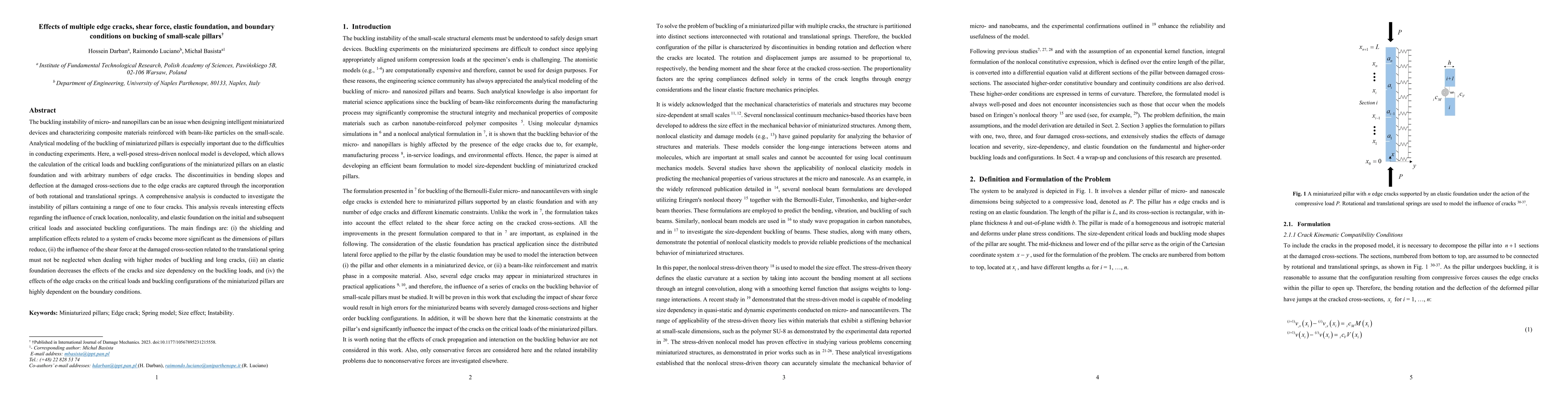 This study develops a nonlocal analytical model to analyze the buckling of micro- and nanopillars under edge cracks, shear force, elastic foundation, and varying boundary conditions. It finds that crack effects amplify with smaller pillar sizes, shear force impacts higher buckling modes, elastic foundations mitigate crack and size effects, and boundary conditions significantly influence critical loads and buckling configurations.