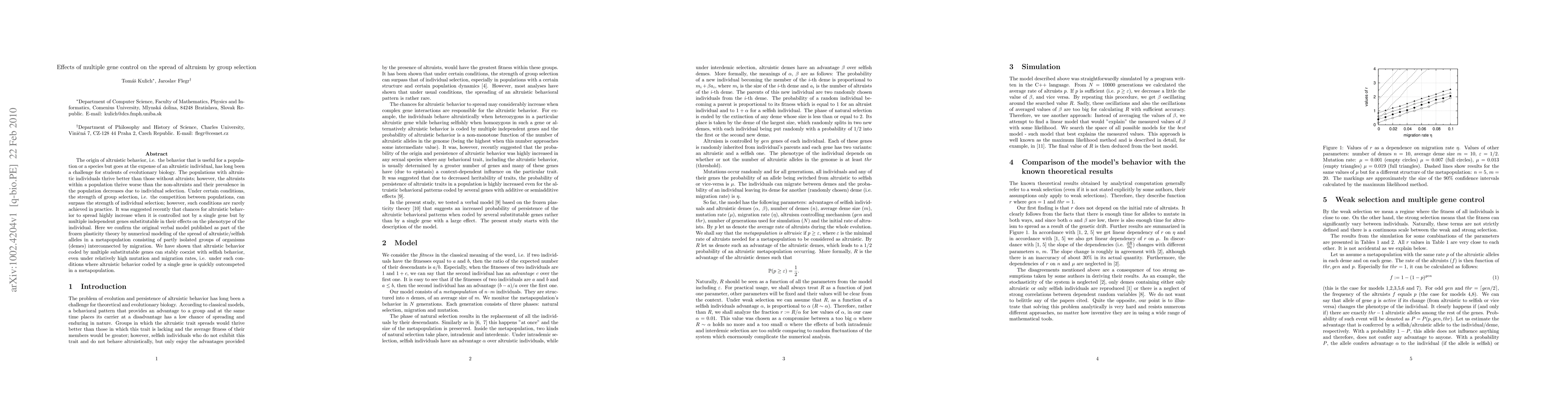 The origin of altruistic behavior, i.e. the behavior that is useful for a population or a species but goes at the expense of an altruistic individual, has long been a challenge for students of evolutionary biology. The populations with altruistic individuals thrive better than those without altruists; however, the altruists within a population thrive worse than the non-altruists and their prevalence in the population decreases due to individual selection. Under certain conditions, the strength of group selection, i.e. the competition between populations, can surpass the strength of individual selection; however, such conditions are rarely achieved in practice. It was suggested recently that chances for altruistic behavior to spread highly increase when it is controlled not by a single gene but by multiple independent genes substitutable in their effects on the phenotype of the individual. Here we confirm the original verbal model published as part of the frozen plasticity theory by numerical modeling of the spread of altruistic/selfish alleles in a metapopulation consisting of partly isolated groups of organisms (demes) interconnected by migration. We have shown that altruistic behavior coded by multiple substitutable genes can stably coexist with selfish behavior, even under relatively high mutation and migration rates, i.e. under such conditions where altruistic behavior coded by a single gene is quickly outcompeted in a metapopulation.