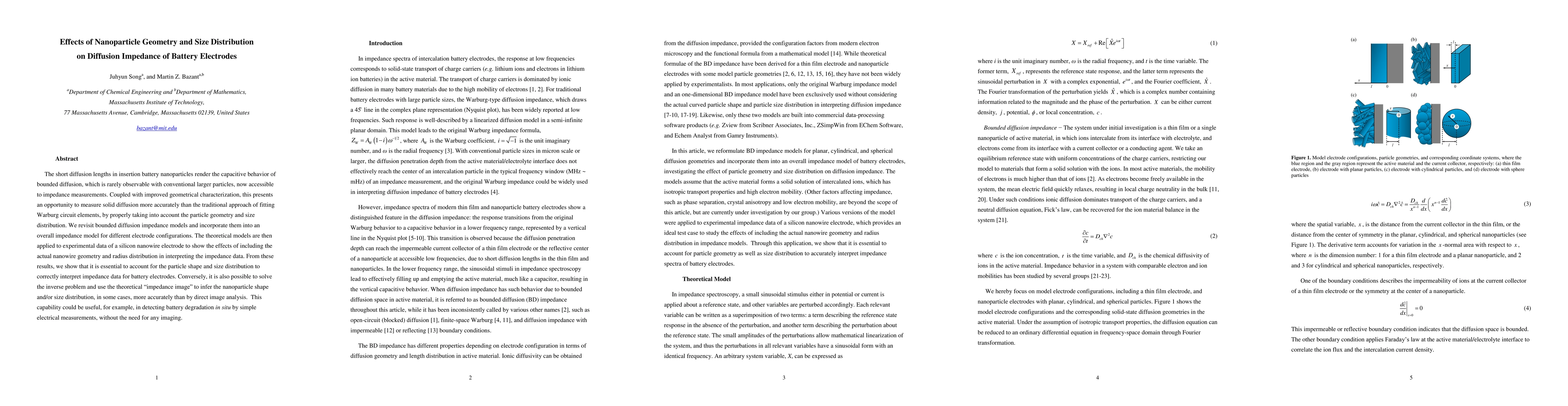 The short diffusion lengths in insertion battery nanoparticles render the capacitive behavior of bounded diffusion, which is rarely observable with conventional larger particles, now accessible to impedance measurements. Coupled with improved geometrical characterization, this presents an opportunity to measure solid diffusion more accurately than the traditional approach of fitting Warburg circuit elements, by properly taking into account the particle geometry and size distribution. We revisit bounded diffusion impedance models and incorporate them into an overall impedance model for different electrode configurations. The theoretical models are then applied to experimental data of a silicon nanowire electrode to show the effects of including the actual nanowire geometry and radius distribution in interpreting the impedance data. From these results, we show that it is essential to account for the particle shape and size distribution to correctly interpret impedance data for battery electrodes. Conversely, it is also possible to solve the inverse problem and use the theoretical "impedance image" to infer the nanoparticle shape and/or size distribution, in some cases, more accurately than by direct image analysis. This capability could be useful, for example, in detecting battery degradation in situ by simple electrical measurements, without the need for any imaging.