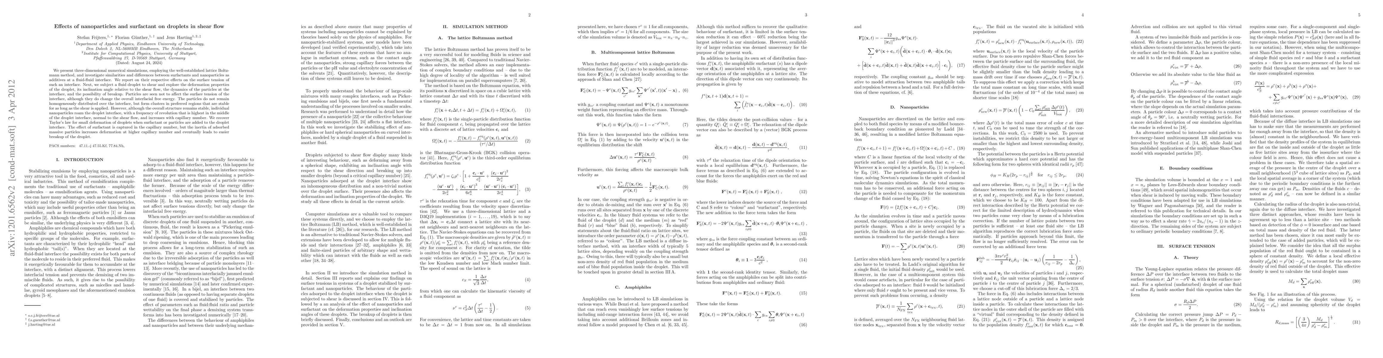 This study uses numerical simulations to compare the effects of surfactants and nanoparticles on droplet deformation in shear flow. While nanoparticles do not alter surface tension, they cluster at the interface and increase deformation and breakup likelihood at higher shear rates due to their inertia.
