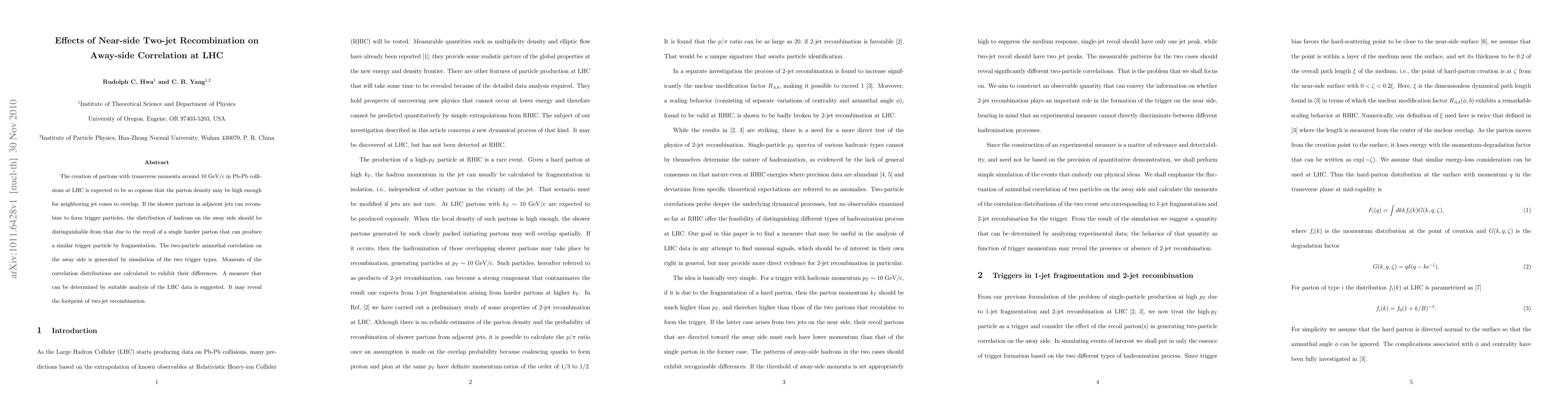 The creation of partons with transverse momenta around 10 GeV/c in Pb-Pb collisions at LHC is expected to be so copious that the parton density may be high enough for neighboring jet cones to overlap. If the shower partons in adjacent jets can recombine to form trigger particles, the distribution of hadrons on the away side should be distinguishable from that due to the recoil of a single harder parton that can produce a similar trigger particle by fragmentation. The two-particle azimuthal correlation on the away side is generated by simulation of the two trigger types. Moments of the correlation distributions are calculated to exhibit their differences. A measure that can be determined by suitable analysis of the LHC data is suggested. It may reveal the footprint of two-jet recombination.
