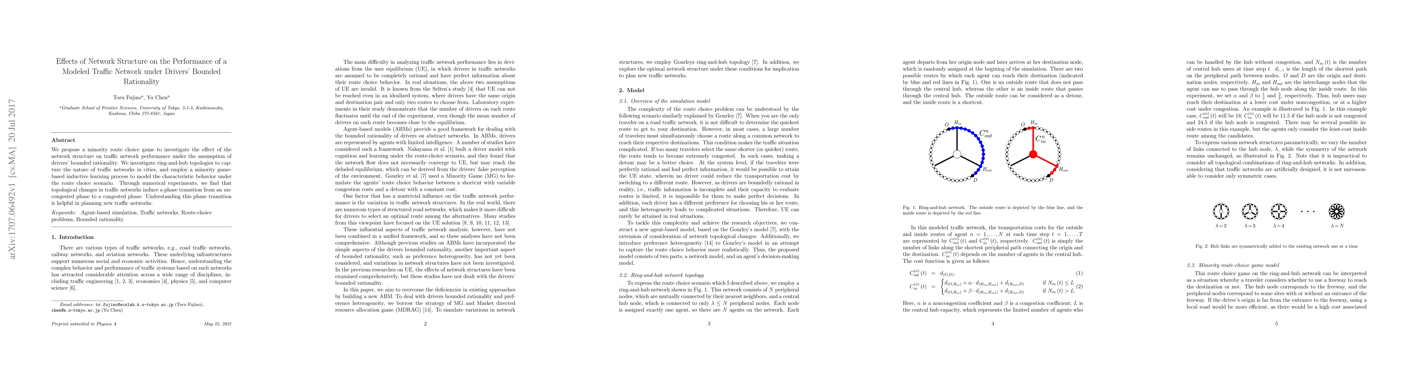 We propose a minority route choice game to investigate the effect of the network structure on traffic network performance under the assumption of drivers' bounded rationality. We investigate ring-and-hub topologies to capture the nature of traffic networks in cities, and employ a minority game-based inductive learning process to model the characteristic behavior under the route choice scenario. Through numerical experiments, we find that topological changes in traffic networks induce a phase transition from an uncongested phase to a congested phase. Understanding this phase transition is helpful in planning new traffic networks.