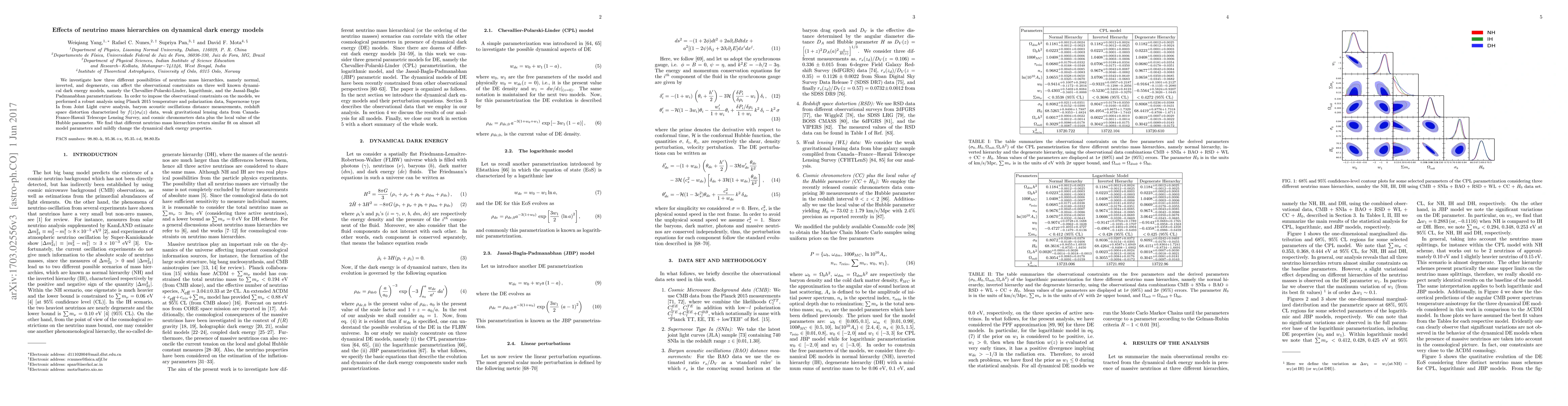This paper examines the impact of normal, inverted, and degenerate neutrino mass hierarchies on three dynamical dark energy models using observational data from various sources including Planck 2015, supernovae, and cosmic chronometers. The study finds that while different neutrino mass hierarchies slightly alter the models, the overall fit on model parameters remains consistent.
