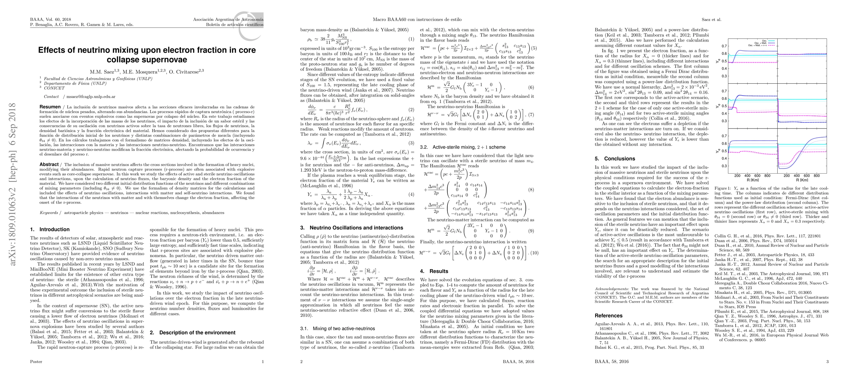The inclusion of massive neutrinos affects the cross sections involved in the formation of heavy nuclei, modifying their abundances. Rapid neutron capture processes (r-process) are often associated with explosive events such as core-collapse supernovae. In this work we study the effects of active and sterile neutrino oscillations and interactions, upon the calculation of neutrino fluxes, the baryonic density and the electron fraction of the material. We have considered two different initial distribution functions of the neutrinos and different combinations of mixing parameters (including {\theta} 34 = 0). We use the formalism of density matrices for the calculations and included the effects of neutrino oscillations, interactions with matter and self-neutrino interactions. We found that the interactions of the neutrinos with matter and with themselves change the electron fraction, affecting the onset of the r-process.