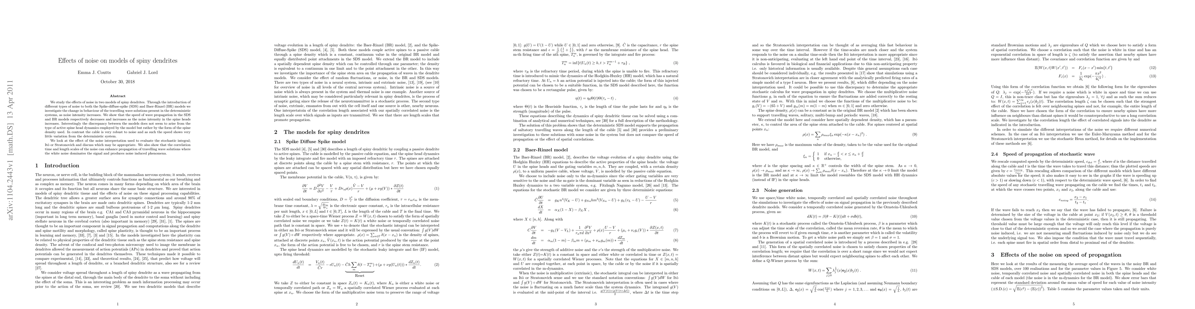 This paper investigates how noise affects two models of spiny dendrites, finding that noise intensity alters wave propagation speed differently in the Spike-diffuse-spike (SDS) and Baer-Rinzel (BR) models, with the discrepancy stemming from spine density form rather than spine dynamics. The cable remains robust to noise.