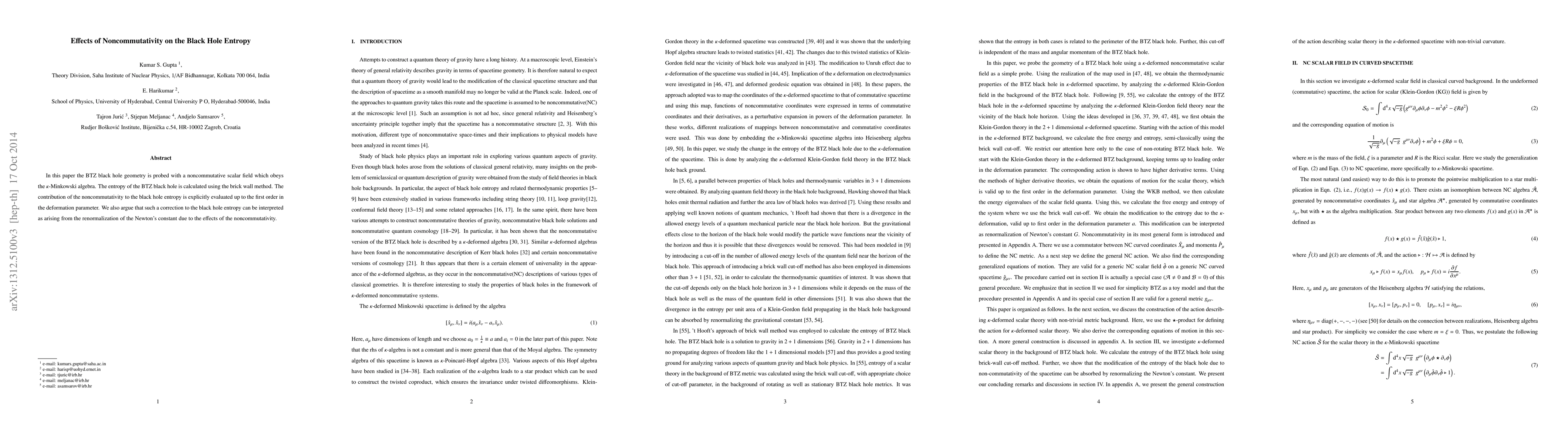 This paper investigates the effects of noncommutativity on the entropy of BTZ black holes using a noncommutative scalar field based on the $\kappa$-Minkowski algebra. The study finds a first-order correction to the black hole entropy and suggests this correction arises from the renormalization of Newton's constant due to noncommutativity.