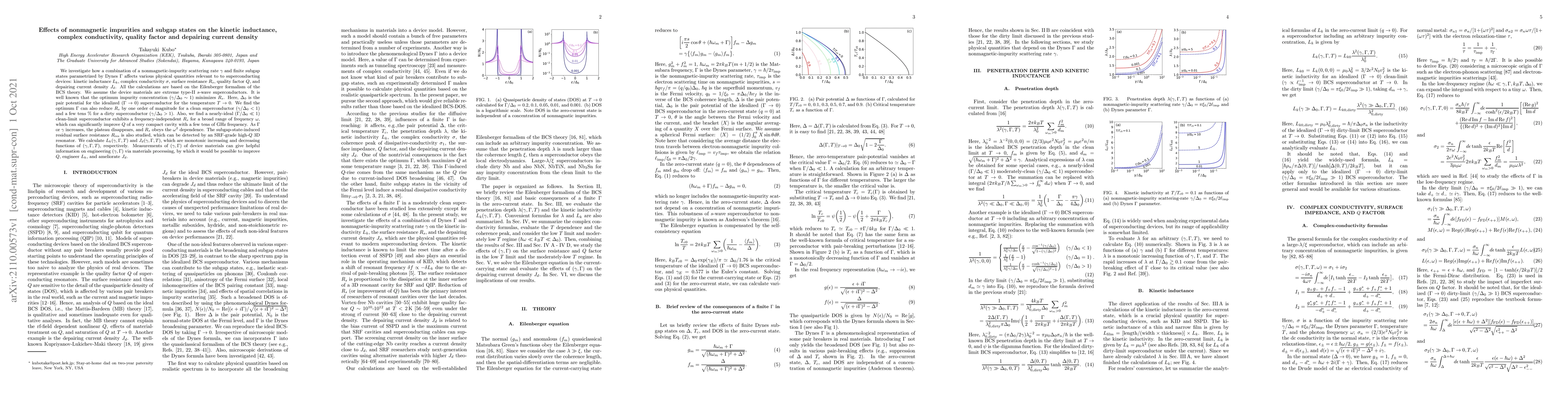 This paper explores the effects of nonmagnetic impurities and subgap states on superconducting properties, including kinetic inductance, complex conductivity, quality factor, and depairing current density, using the Eilenberger formalism. It finds that optimal impurity concentration and subgap states can significantly reduce surface resistance and improve the quality factor of superconducting devices.