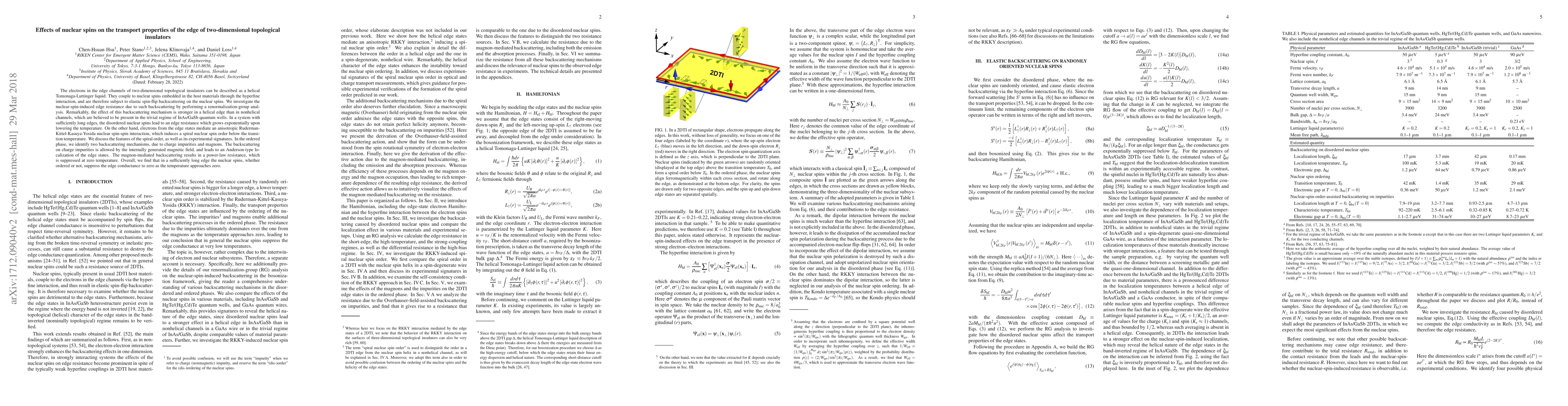 The electrons in the edge channels of two-dimensional topological insulators can be described as a helical Tomonaga-Luttinger liquid. They couple to nuclear spins embedded in the host materials through the hyperfine interaction, and are therefore subject to elastic spin-flip backscattering on the nuclear spins. We investigate the nuclear-spin-induced edge resistance due to such backscattering by performing a renormalization-group analysis. Remarkably, the effect of this backscattering mechanism is stronger in a helical edge than in nonhelical channels, which are believed to be present in the trivial regime of InAs/GaSb quantum wells. In a system with sufficiently long edges, the disordered nuclear spins lead to an edge resistance which grows exponentially upon lowering the temperature. On the other hand, electrons from the edge states mediate an anisotropic Ruderman-Kittel-Kasuya-Yosida nuclear spin-spin interaction, which induces a spiral nuclear spin order below the transition temperature. We discuss the features of the spiral order, as well as its experimental signatures. In the ordered phase, we identify two backscattering mechanisms, due to charge impurities and magnons. The backscattering on charge impurities is allowed by the internally generated magnetic field, and leads to an Anderson-type localization of the edge states. The magnon-mediated backscattering results in a power-law resistance, which is suppressed at zero temperature. Overall, we find that in a sufficiently long edge the nuclear spins, whether ordered or not, suppress the edge conductance to zero as the temperature approaches zero.
