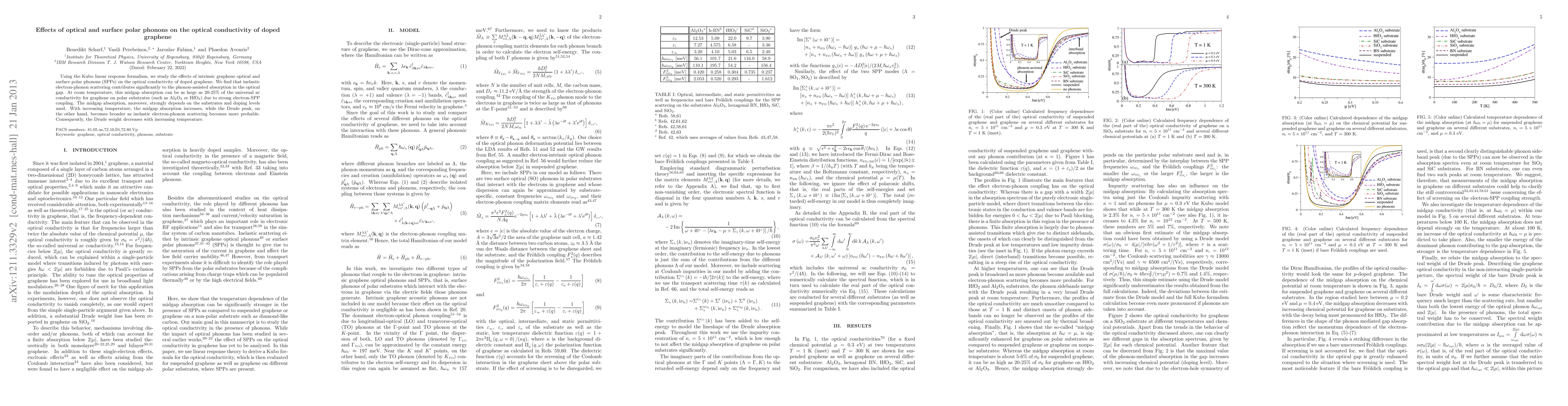 Summary: This study investigates how optical and surface polar phonons impact the optical conductivity of doped graphene using the Kubo linear response formalism. It reveals that inelastic electron-phonon scattering significantly contributes to phonon-assisted absorption, especially at room temperature where midgap absorption can reach 20-25% of the universal ac conductivity, strongly influenced by substrate and doping levels. As temperature rises, midgap absorption increases while the Drude peak broadens, leading to a decrease in Drude weight.