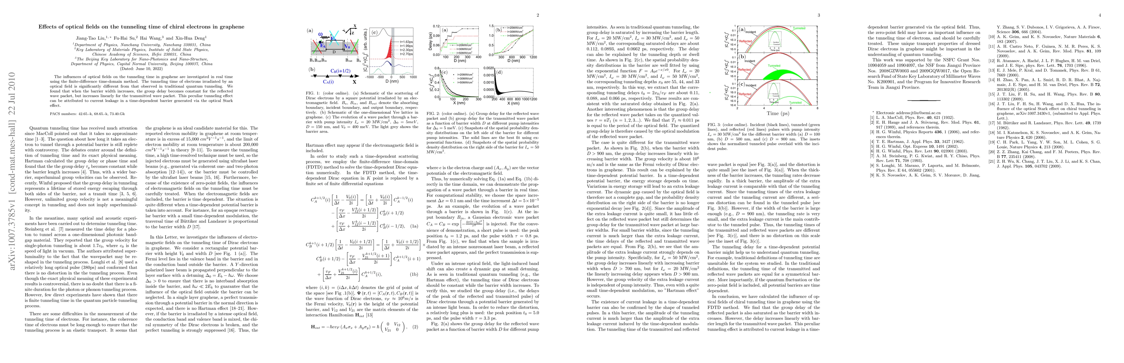 Summary: This study investigates how optical fields affect the tunneling time of chiral electrons in graphene, revealing significant differences from traditional quantum tunneling. The research shows that the group delay for reflected wave packets becomes constant with increasing barrier width, while the transmitted wave packet's delay increases linearly, attributed to current leakage due to the optical Stark effect.