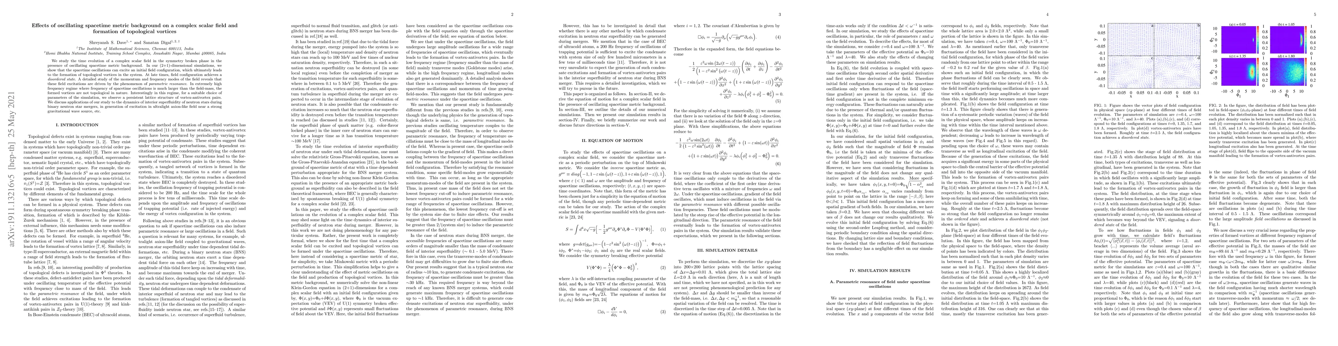 We study the time evolution of a complex scalar field in the symmetry broken phase in the presence of oscillating spacetime metric background. In our (2+1)-dimensional simulations, we show that the spacetime oscillations can excite an initial field configuration, which ultimately leads to the formation of topological vortices in the system. At late times, field configuration achieves a disordered state. A detailed study of the momentum and frequency modes of the field reveals that these field excitations are driven by the phenomenon of parametric resonance. In extremely high frequency regime where frequency of spacetime oscillations is much larger than the field-mass, the formed vortices are not topological in nature. Interestingly in this regime, for a suitable choice of parameters of the simulation, we observe a persistent lattice structure of vortex-antivortex pairs. We discuss applications of our study to the dynamics of interior superfluidity of neutron stars during binary neutron star mergers, in generation of excitation in ultralight axion-like field near a strong gravitational wave source, etc.