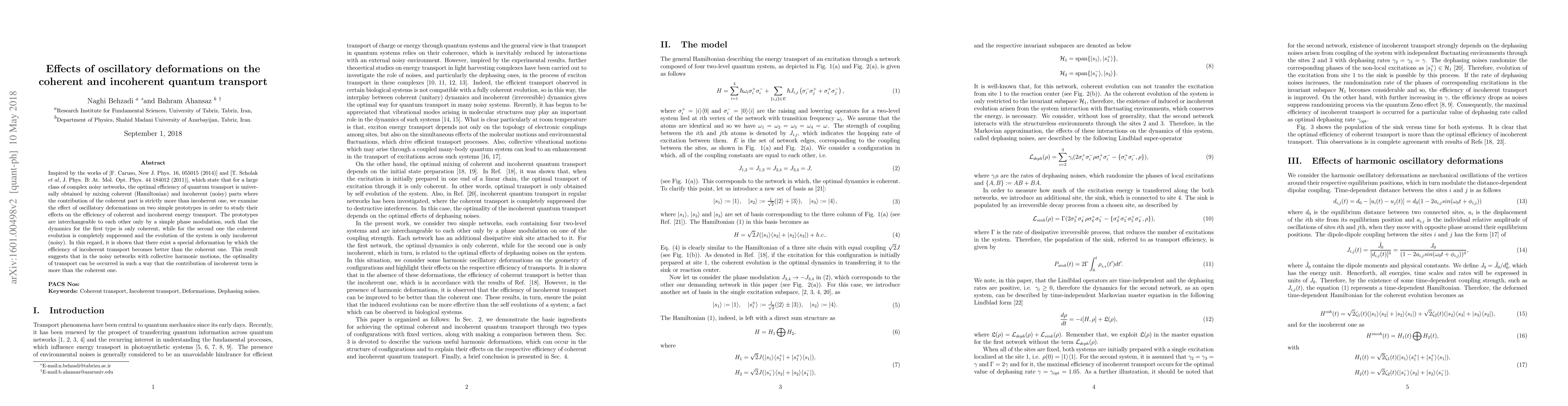 This paper investigates how oscillatory deformations affect the efficiency of coherent and incoherent quantum transport in simple prototypes, revealing that certain deformations can make incoherent transport more efficient than coherent transport, challenging the traditional view that coherent transport is universally superior.