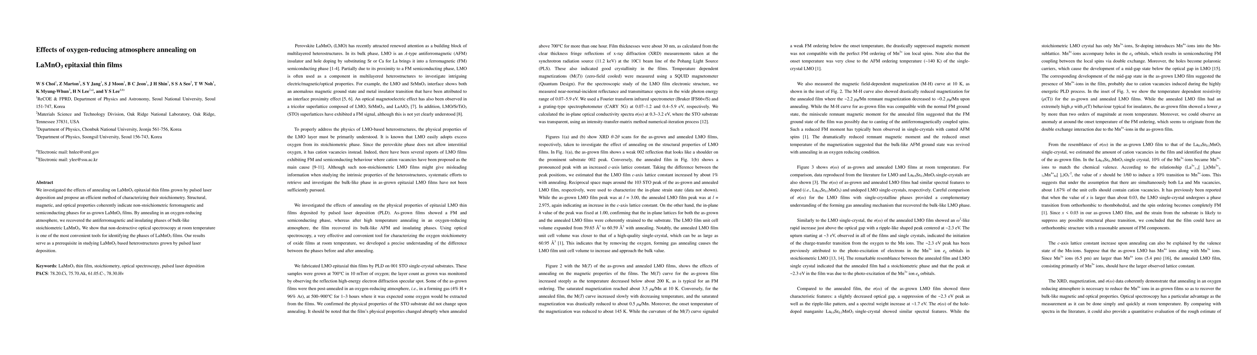 This study examines the impact of oxygen-reducing atmosphere annealing on LaMnO$_3$ epitaxial thin films, revealing that such treatment restores the antiferromagnetic and insulating bulk-like stoichiometry. Non-destructive optical spectroscopy at room temperature is identified as an effective method for phase characterization.