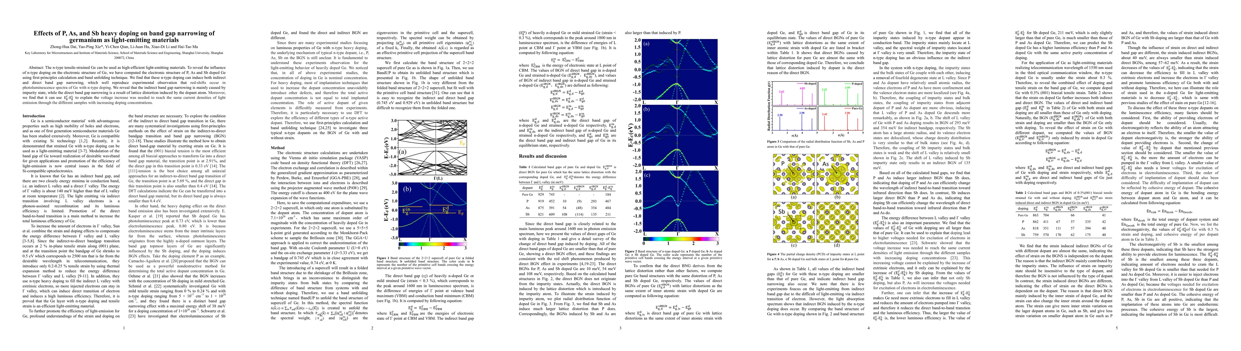 The n-type tensile-strained Ge can be used as high-efficient light-emitting materials. To reveal the influence of n-type doping on the electronic structure of Ge, we have computed the electronic structure of P, As and Sb doped Ge using first-principles calculation and band unfolding technique. We find that these n-type doping can induce both indirect and direct band gap narrowing, which well reproduce experimental observation that red-shifts occur in photoluminescence spectra of Ge with n-type doping. We reveal that the indirect band gap narrowing is mainly caused by impurity state, while the direct band gap narrowing is a result of lattice distortion induced by the dopant atom. Moreover, we find that it can use E_g^{\Gamma}-E_g^L to explain the voltage increase was needed to reach the same current densities of light emission through the different samples with increasing doping concentrations.