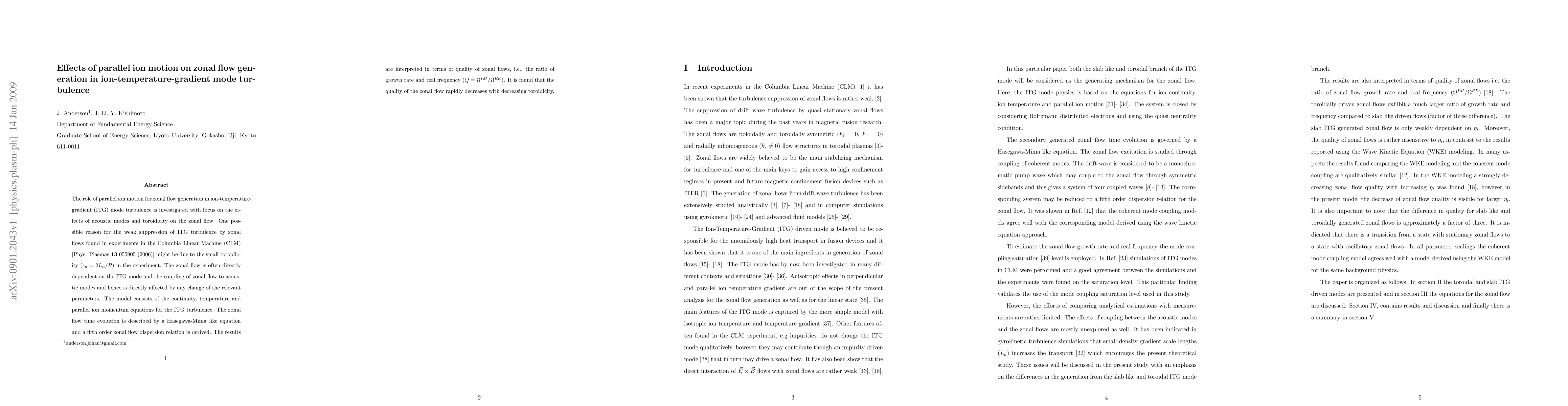 This paper investigates how parallel ion motion influences the generation of zonal flows in ion-temperature-gradient mode turbulence, focusing on the effects of acoustic modes and toroidicity. It finds that lower toroidicity weakens the suppression of turbulence by zonal flows, suggesting a critical role of toroidicity in the quality of zonal flow generation.