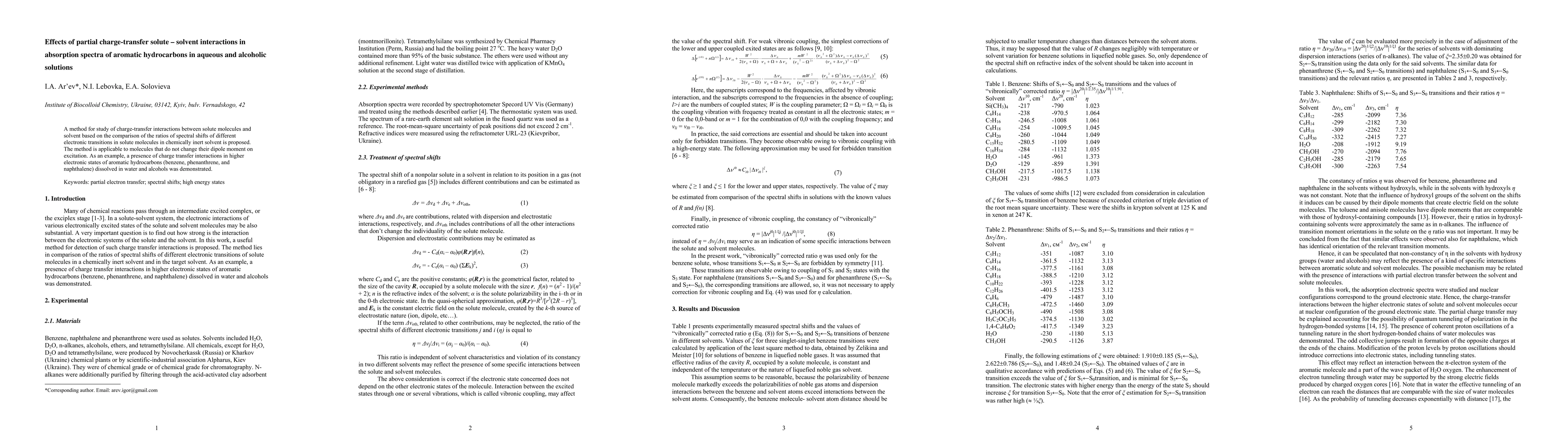 This paper proposes a method for studying charge-transfer interactions between solutes and solvents by comparing spectral shifts in different electronic transitions. It demonstrates the presence of such interactions in aromatic hydrocarbons like benzene, phenanthrene, and naphthalene in aqueous and alcoholic solutions.