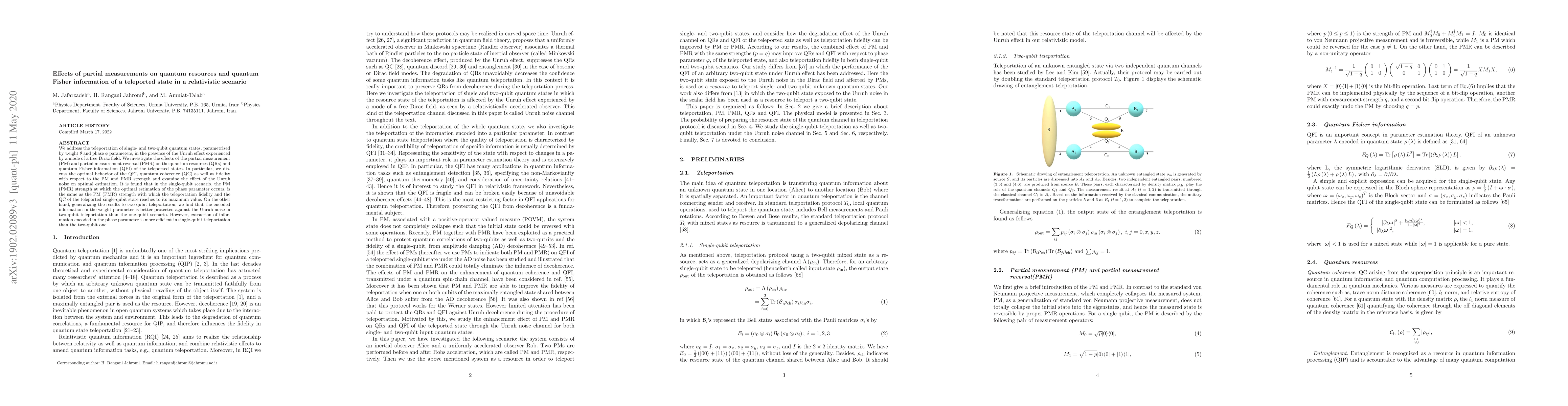 This paper examines the impact of partial measurements and their reversal on quantum resources and quantum Fisher information in quantum teleportation under the Unruh effect. It reveals that optimal phase parameter estimation in single-qubit teleportation coincides with maximum fidelity and coherence, while two-qubit teleportation better protects weight information against Unruh noise but favors phase parameter extraction in single-qubit teleportation.