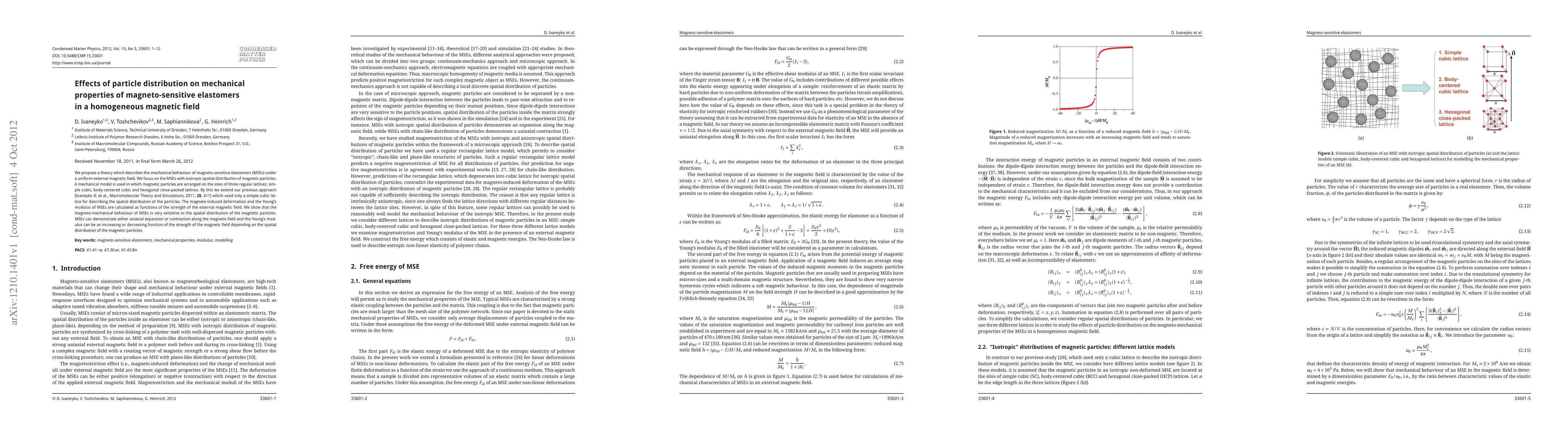 This paper proposes a theory to describe the mechanical behavior of magneto-sensitive elastomers under a uniform magnetic field, focusing on the effects of different spatial distributions of magnetic particles. It shows that the magneto-mechanical response, including deformation and Young's modulus, varies significantly based on the arrangement of particles in different lattices.