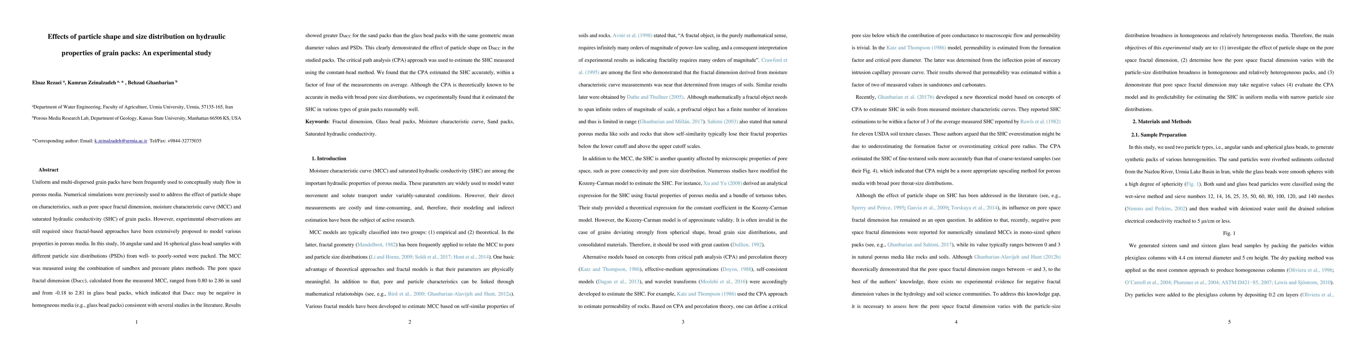 Uniform and multi-dispersed grain packs have been frequently used to conceptually study flow in porous media. Numerical simulations were previously used to address the effect of particle shape on characteristics, such as pore space fractal dimension, moisture characteristic curve (MCC) and saturated hydraulic conductivity (SHC) of grain packs. However, experimental observations are still required since fractal-based approaches have been extensively proposed to model various properties in porous media. In this study, 16 angular sand and 16 spherical glass bead samples with different particle size distributions (PSDs) from well- to poorly-sorted were packed. The MCC was measured using the combination of sandbox and pressure plates methods. The pore space fractal dimension (DMCC), calculated from the measured MCC, ranged from 0.80 to 2.86 in sand and from -0.18 to 2.81 in glass bead packs, which indicated that DMCC may be negative in homogenous media (e.g., glass bead packs) consistent with several studies in the literature. Results showed greater DMCC for the sand packs than the glass bead packs with the same geometric mean diameter values and PSDs. This clearly demonstrated the effect of particle shape on DMCC in the studied packs. The critical path analysis (CPA) approach was used to estimate the SHC measured using the constant-head method. We found that the CPA estimated the SHC accurately, within a factor of four of the measurements on average. Although the CPA is theoretically known to be accurate in media with broad pore size distributions, we experimentally found that it estimated the SHC in various types of grain packs reasonably well.