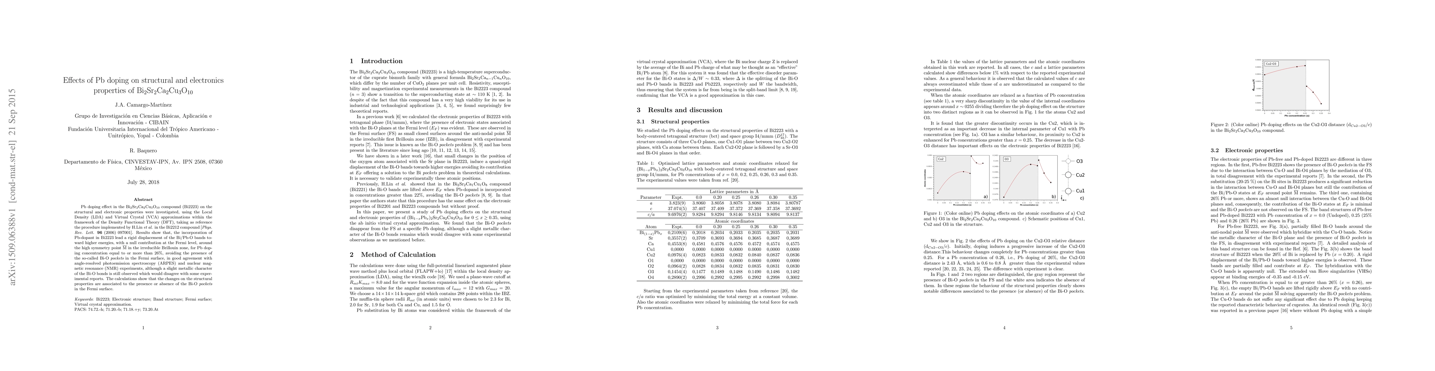 Pb doping effect in the Bi$_2$Sr$_2$Ca$_2$Cu$_3$O$_{10}$ compound (Bi2223) on the structural and electronic properties were investigated, using the Local Density (LDA) and Virtual Crystal (VCA) approximations within the framework of the Density Functional Theory (DFT), taking as reference the procedure implemented by H.Lin {\it et al.} in the Bi2212 compound [{\it Phys. Rev. Lett.} {\bf 96} (2006) 097001]. Results show that, the incorporation of Pb-dopant in Bi2223 lead a rigid displacement of the Bi/Pb-O bands toward higher energies, with a null contribution at the Fermi level, around the high symmetry point $\overline{\text{M}}$ in the irreducible Brillouin zone, for Pb doping concentration equal to or more than 26\%, avoiding the presence of the so-called Bi-O {\it pockets} in the Fermi surface, in good agreement with angle-resolved photoemission spectroscopy (ARPES) and nuclear magnetic resonance (NMR) experiments, although a slight metallic character of the Bi-O bonds is still observed which would disagree with some experimental reports. The calculations show that the changes on the structural properties are associated to the presence or absence of the Bi-O {\it pockets} in the Fermi surface