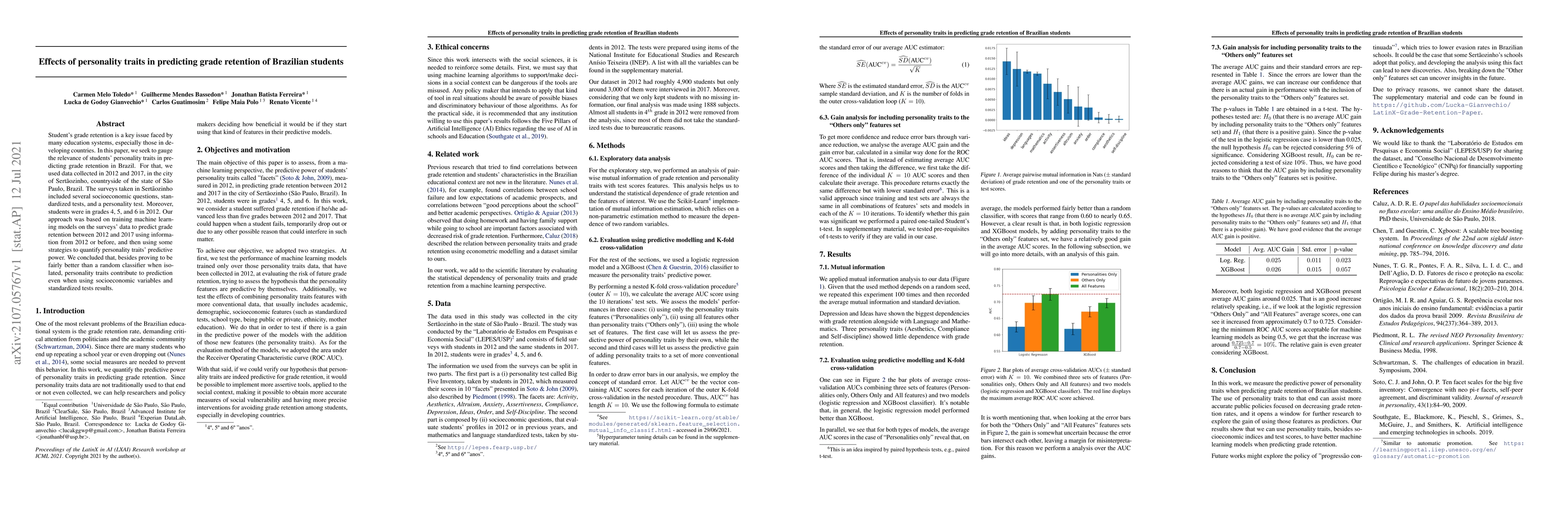 This paper investigates the predictive power of personality traits in determining grade retention among Brazilian students in Sertaozinho. Using machine learning models trained on 2012 data, the study finds that personality traits enhance retention predictions even when combined with socioeconomic and standardized test results.