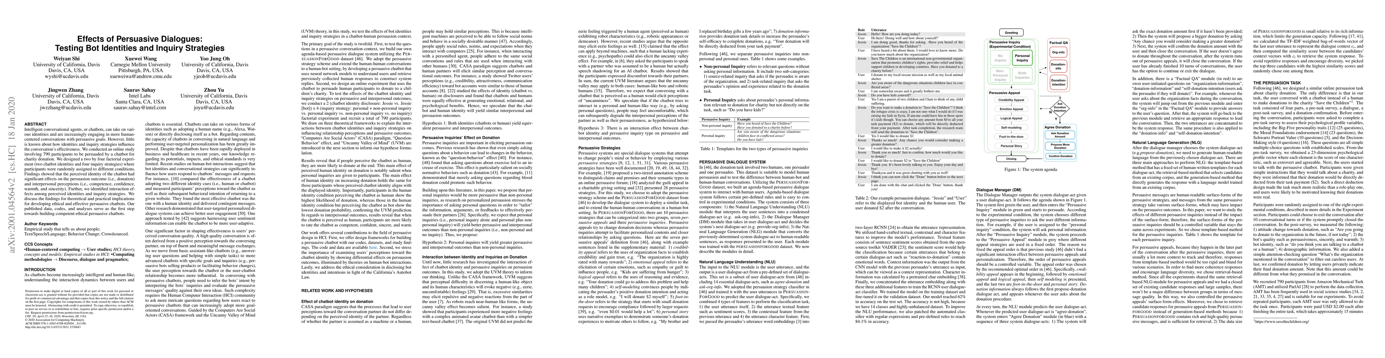 This study investigates how chatbot identities and inquiry strategies impact persuasion effectiveness in charity donation scenarios. Results from a large online experiment reveal significant effects of chatbot identity on donation outcomes and interpersonal perceptions, with notable interactions between identity and inquiry strategies.