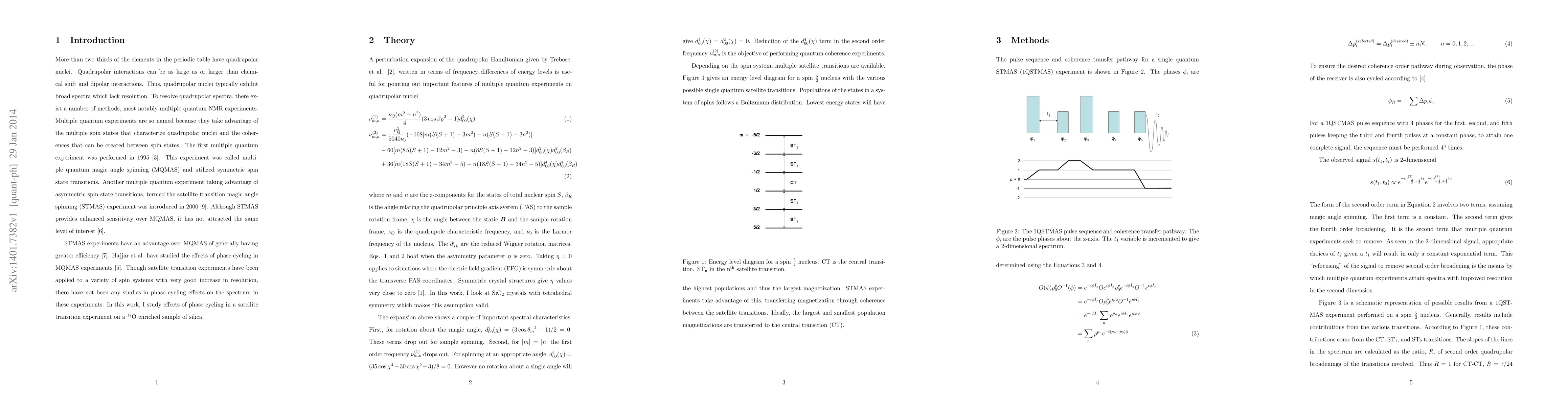 Multiple quantum experiments are used to resolve broad peaks in nuclear magnetic resonance spectra of quadrupolar nuclei. In this work, we study phase cycling of radio frequency pulses in a single quantum satellite transition magic angle spinning experiment. The particular pulse sequence is a shifted echo sequence where phases of the pulses are varied in accordance with coherence selection rules. Experiments were performed on a $^{17}$O enriched sample of SiO$_2$. Results show that certain phase sequences may decrease the full width at half maximum of spectral peaks.