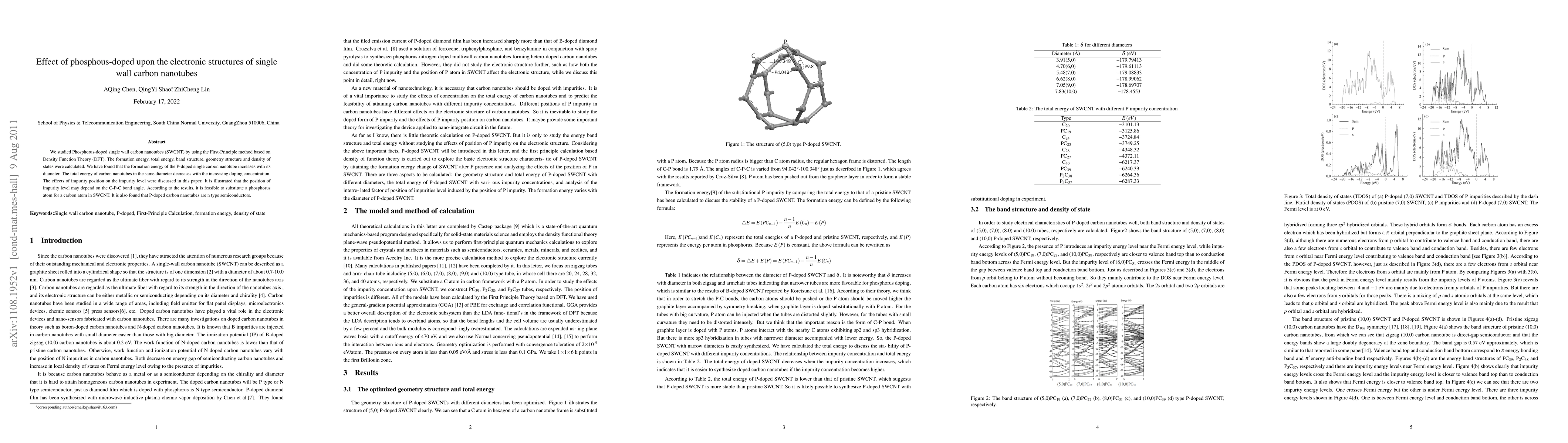 This study reveals that phosphorus doping in single wall carbon nanotubes (SWCNT) increases formation energy with tube diameter, while decreasing total energy with higher doping rates. The position of impurity levels depends on the C-P-C bond angle, indicating potential for substituting carbon atoms with phosphorus in SWCNT, resulting in N-type semiconductor behavior.