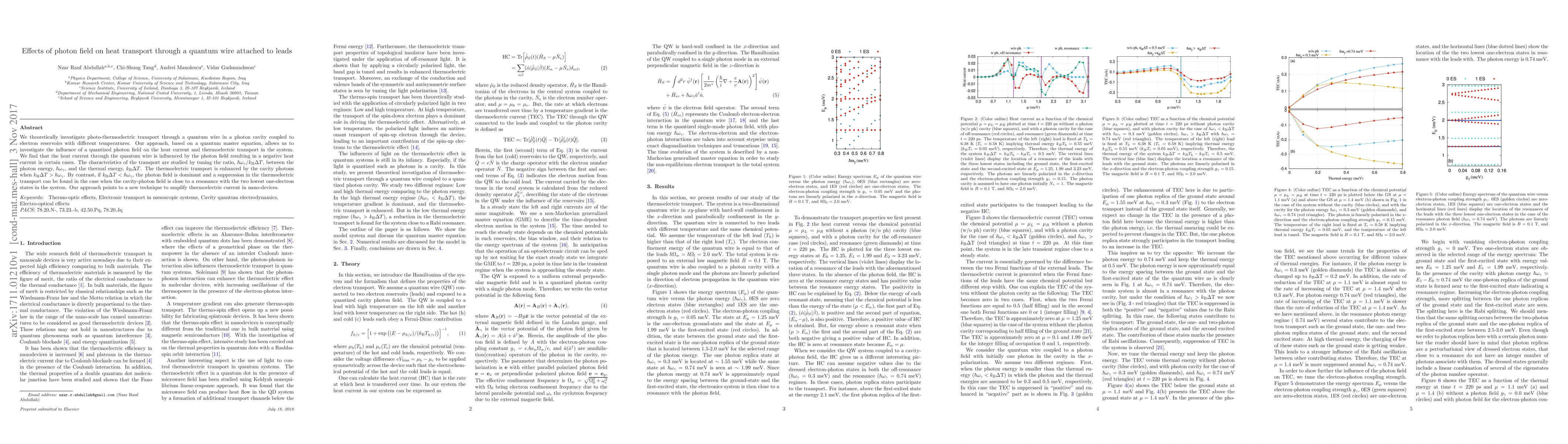 The paper presents a theoretical investigation of photo-thermoelectric transport through a quantum wire in a photon cavity, using a quantum master equation approach to analyze the influence of a quantized photon field on heat current and thermoelectric transport.
