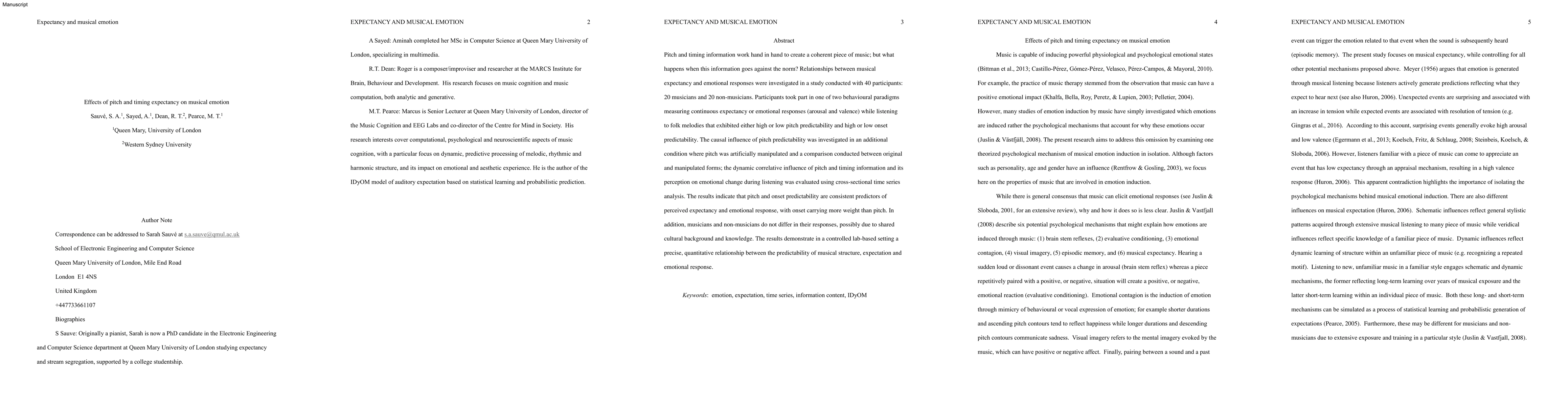 This study explores how pitch and timing predictability influence musical emotion, finding that onset predictability has a stronger effect than pitch. Both musicians and non-musicians showed similar emotional responses, suggesting shared cultural factors play a significant role in musical expectancy.