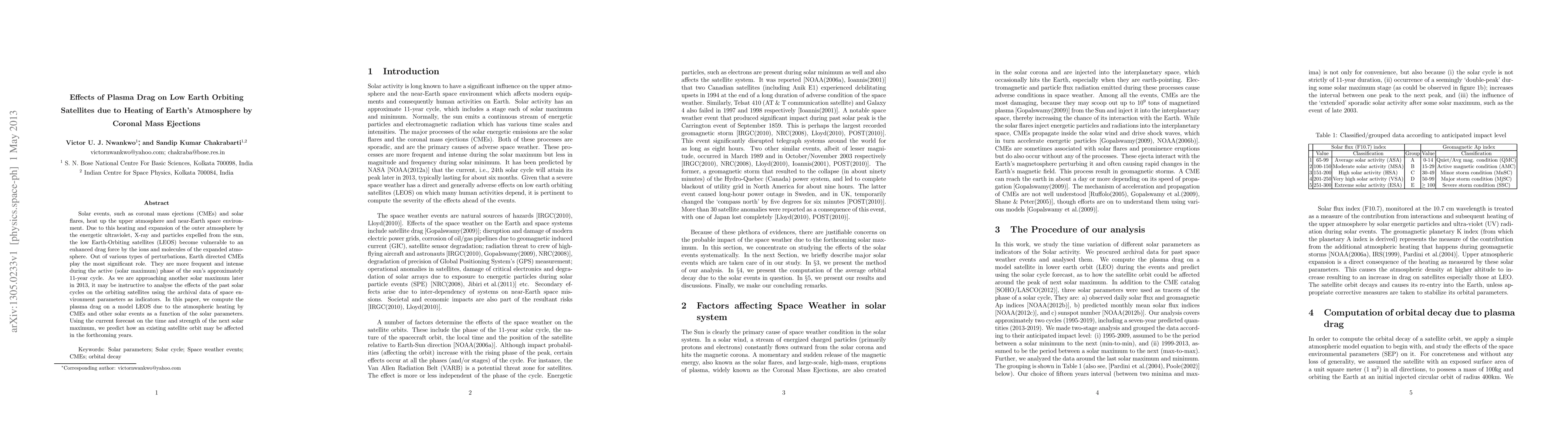 This paper investigates the impact of coronal mass ejections (CMEs) on the drag force experienced by low Earth orbiting satellites due to atmospheric heating, predicting future orbital changes based on past solar cycles and current forecasts of the upcoming solar maximum. The study models plasma drag effects and assesses their significance for satellite operations.