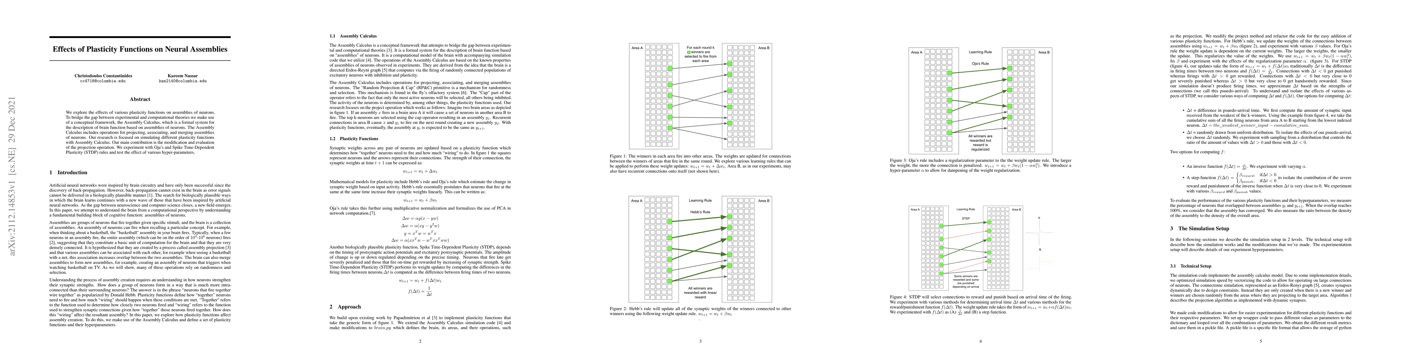 This research paper investigates how different plasticity functions affect neural assemblies using the Assembly Calculus framework. It simulates Oja's and Spike Time-Dependent Plasticity rules with varying hyperparameters to test their effects on neural assembly formation and function.