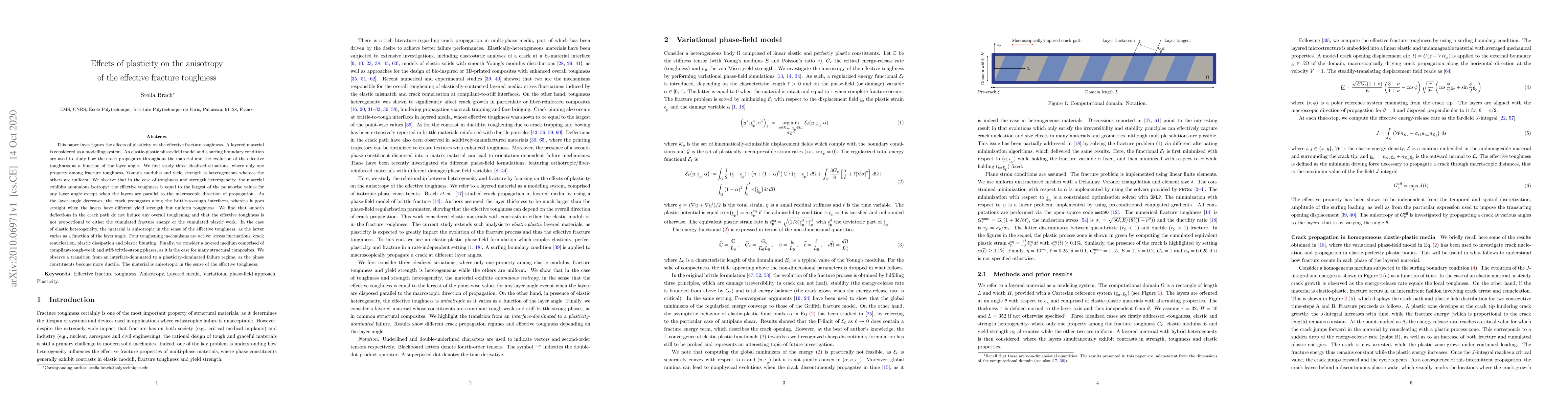 This paper investigates the effects of plasticity on the effective fracture toughness. A layered material is considered as a modelling system. An elastic-plastic phase-field model and a surfing boundary condition are used to study how the crack propagates throughout the material and the evolution of the effective toughness as a function of the layer angle. We first study three idealized situations, where only one property among fracture toughness, Young's modulus and yield strength is heterogeneous whereas the others are uniform. We observe that in the case of toughness and strength heterogeneity, the material exhibits anomalous isotropy: the effective toughness is equal to the largest of the point-wise values for any layer angle except when the layers are parallel to the macroscopic direction of propagation. As the layer angle decreases, the crack propagates along the brittle-to-tough interfaces, whereas it goes straight when the layers have different yield strength but uniform toughness. We find that smooth deflections in the crack path do not induce any overall toughening and that the effective toughness is not proportional to either the cumulated fracture energy or the cumulated plastic work. In the case of elastic heterogeneity, the material is anisotropic in the sense of the effective toughness, as the latter varies as a function of the layer angle. Four toughening mechanisms are active: stress fluctuations, crack renucleation, plastic dissipation and plastic blunting. Finally, we consider a layered medium comprised of compliant-tough-weak and stiff-brittle-strong phases, as it is the case for many structural composites. We observe a transition from an interface-dominated to a plasticity-dominated failure regime, as the phase constituents become more ductile. The material is anisotropic in the sense of the effective toughness.