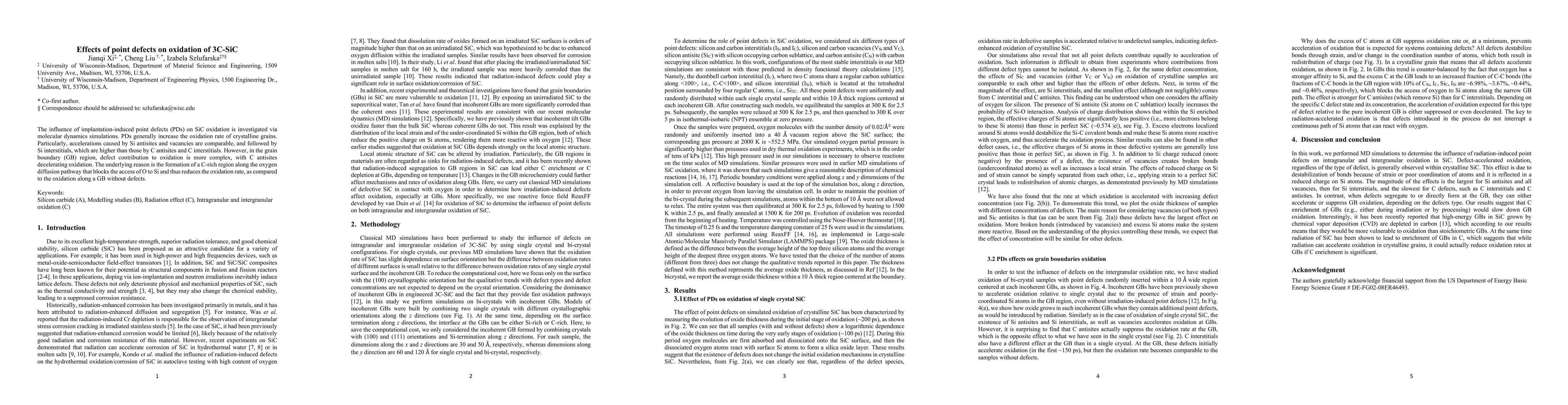 The influence of implantation-induced point defects (PDs) on SiC oxidation is investigated via molecular dynamics simulations. PDs generally increase the oxidation rate of crystalline grains. Particularly, accelerations caused by Si antisites and vacancies are comparable, and followed by Si interstitials, which are higher than those by C antisites and C interstitials. However, in the grain boundary (GB) region, defect contribution to oxidation is more complex, with C antisites decelerating oxidation. The underlying reason is the formation of a C-rich region along the oxygen diffusion pathway that blocks the access of O to Si and thus reduces the oxidation rate, as compared to the oxidation along a GB without defects.