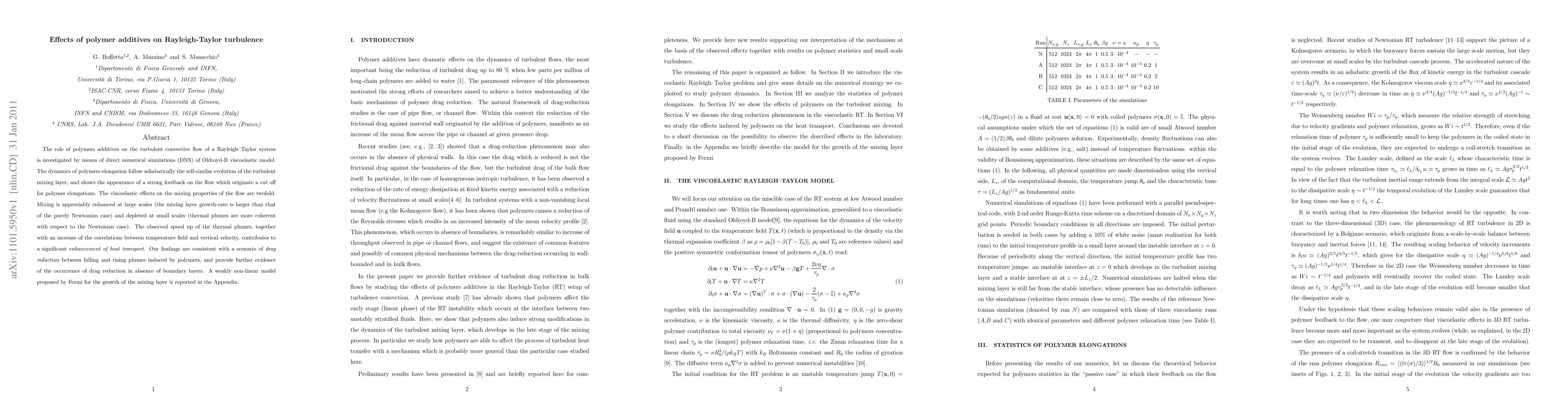 The role of polymers additives on the turbulent convective flow of a Rayleigh--Taylor system is investigated by means of direct numerical simulations (DNS) of Oldroyd-B viscoelastic model. The dynamics of polymers elongation follow adiabatically the self-similar evolution of the turbulent mixing layer, and shows the appearance of a strong feedback on the flow which originate a cut off for polymer elongations. The viscoelastic effects on the mixing properties of the flow are twofold. Mixing is appreciably enhanced at large scales (the mixing layer growth-rate is larger than that of the purely Newtonian case) and depleted at small scales (thermal plumes are more coherent with respect to the Newtonian case). The observed speed up of the thermal plumes, together with an increase of the correlations between temperature field and vertical velocity, contributes to a significant {\it enhancement of heat transport}. Our findings are consistent with a scenario of {\it drag reduction} between falling and rising plumes induced by polymers, and provide further evidence of the occurrence of drag reduction in absence of boundary layers. A weakly non-linear model proposed by Fermi for the growth of the mixing layer is reported in the Appendix.