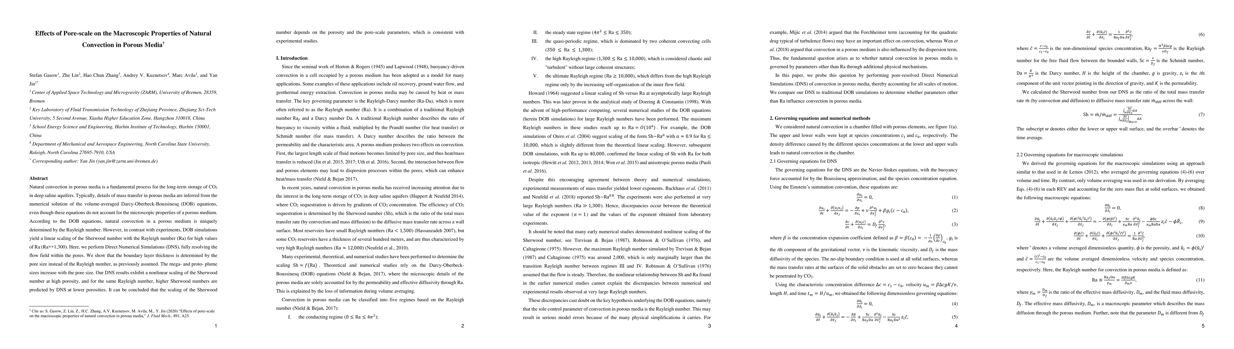 Natural convection in porous media is a fundamental process for the long-term storage of CO2 in deep saline aquifers. Typically, details of mass transfer in porous media are inferred from the numerical solution of the volume-averaged Darcy-Oberbeck-Boussinesq (DOB) equations, even though these equations do not account for the microscopic properties of a porous medium. According to the DOB equations, natural convection in a porous medium is uniquely determined by the Rayleigh number. However, in contrast with experiments, DOB simulations yield a linear scaling of the Sherwood number with the Rayleigh number (Ra) for high values of Ra (Ra>>1,300). Here, we perform Direct Numerical Simulations (DNS), fully resolving the flow field within the pores. We show that the boundary layer thickness is determined by the pore size instead of the Rayleigh number, as previously assumed. The mega- and proto- plume sizes increase with the pore size. Our DNS results exhibit a nonlinear scaling of the Sherwood number at high porosity, and for the same Rayleigh number, higher Sherwood numbers are predicted by DNS at lower porosities. It can be concluded that the scaling of the Sherwood number depends on the porosity and the pore-scale parameters, which is consistent with experimental studies.