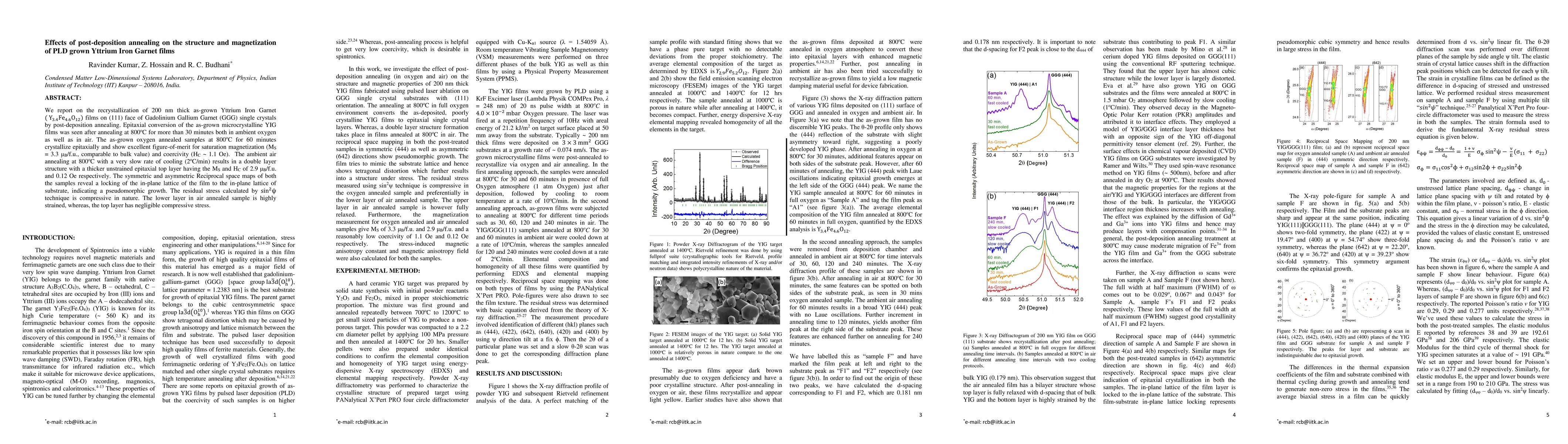 We report on the recrystallization of 200 nm thick as-grown Yttrium Iron Garnet (Y_3.4 Fe_4.6 O_12) films on (111) face of Gadolinium Gallium Garnet (GGG) single crystals by post-deposition annealing. Epitaxial conversion of the as-grown microcrystalline YIG films was seen after annealing at 800oC for more than 30 minutes both in ambient oxygen as well as in air. The as-grown oxygen annealed samples at 800oC for 60 minutes crystallize epitaxially and show excellent figure-of-merit for saturation magnetization (MS = 3.3 {\mu}B/f.u., comparable to bulk value) and coercivity (HC ~ 1.1 Oe). The ambient air annealing at 800oC with a very slow rate of cooling (2oC/min) results in a double layer structure with a thicker unstrained epitaxial top layer having the MS and HC of 2.9 {\mu}B/f.u. and 0.12 Oe respectively. The symmetric and asymmetric Reciprocal space maps of both the samples reveal a locking of the in-plane lattice of the film to the in-plane lattice of substrate, indicating a pseudomorphic growth. The residual stress calculated by sin^2 {\psi} technique is compressive in nature. The lower layer in air annealed sample is highly strained, whereas, the top layer has negligible compressive stress.