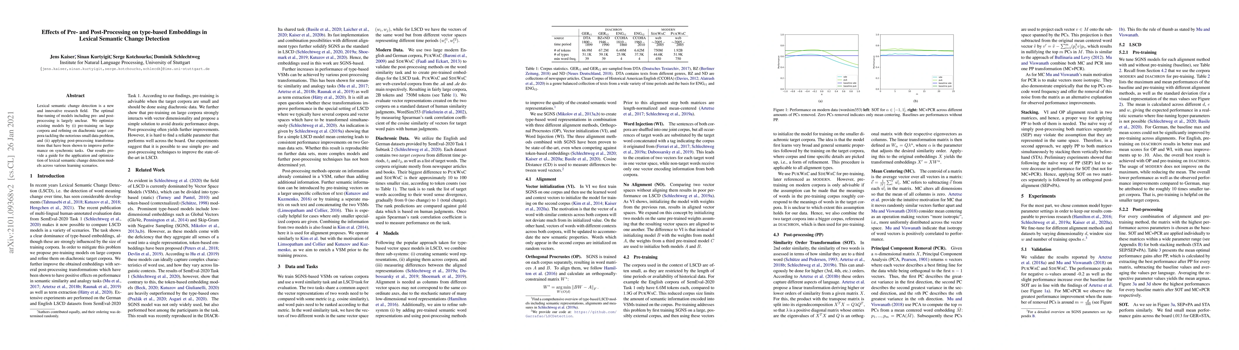 Lexical semantic change detection is a new and innovative research field. The optimal fine-tuning of models including pre- and post-processing is largely unclear. We optimize existing models by (i) pre-training on large corpora and refining on diachronic target corpora tackling the notorious small data problem, and (ii) applying post-processing transformations that have been shown to improve performance on synchronic tasks. Our results provide a guide for the application and optimization of lexical semantic change detection models across various learning scenarios.