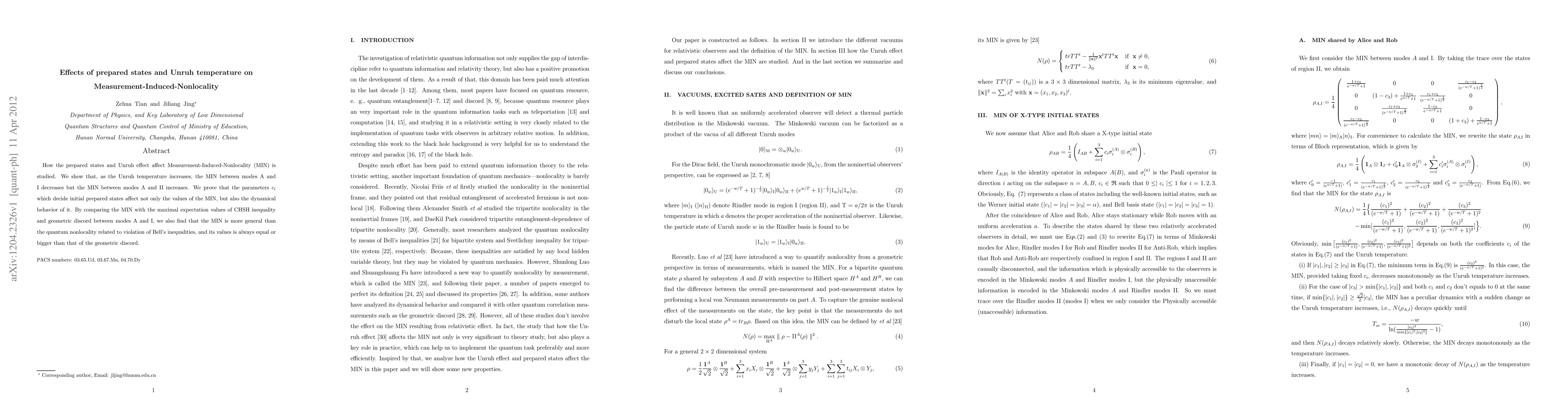 How the prepared states and Unruh effect affect Measurement-Induced-Nonlocality (MIN) is studied. We show that, as the Unruh temperature increases, the MIN between modes $\mathrm{A}$ and $\mathrm{I}$ decreases but the MIN between modes $\mathrm{A}$ and $\mathrm{II}$ increases. We prove that the parameters $c_i$ which decide initial prepared states affect not only the values of the MIN, but also the dynamical behavior of it. By comparing the MIN with the maximal expectation values of CHSH inequality and geometric discord between modes $\mathrm{A}$ and $\mathrm{I}$, we also find that the MIN is more general than the quantum nonlocality related to violation of Bell's inequalities, and its values is always equal or bigger than that of the geometric discord.