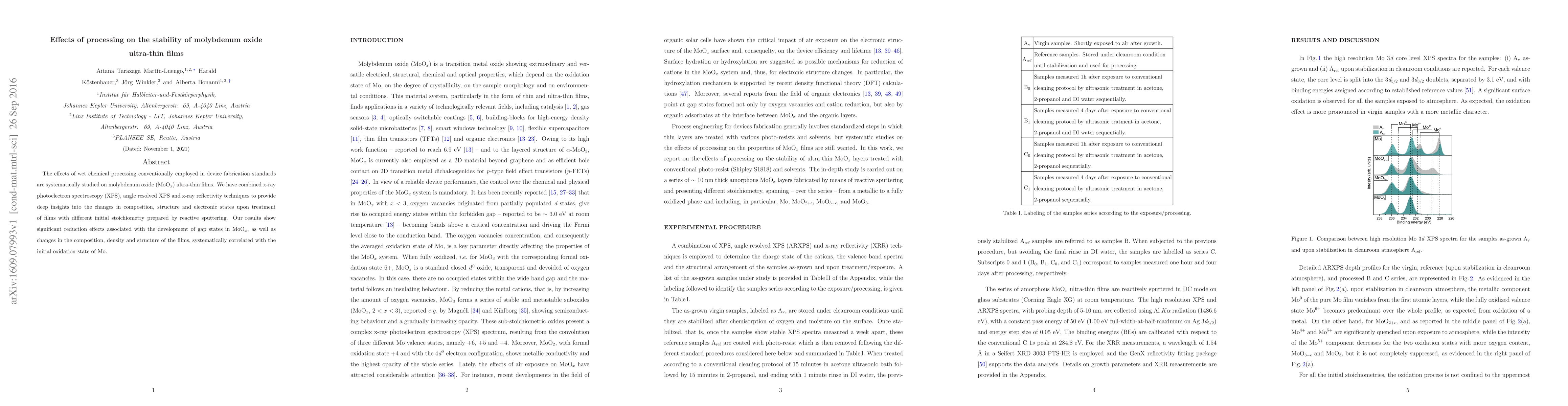 The paper presents a comprehensive analysis of MoOx ultra-thin films' stability under wet chemical processing, providing insights into compositional, structural, and electronic changes.