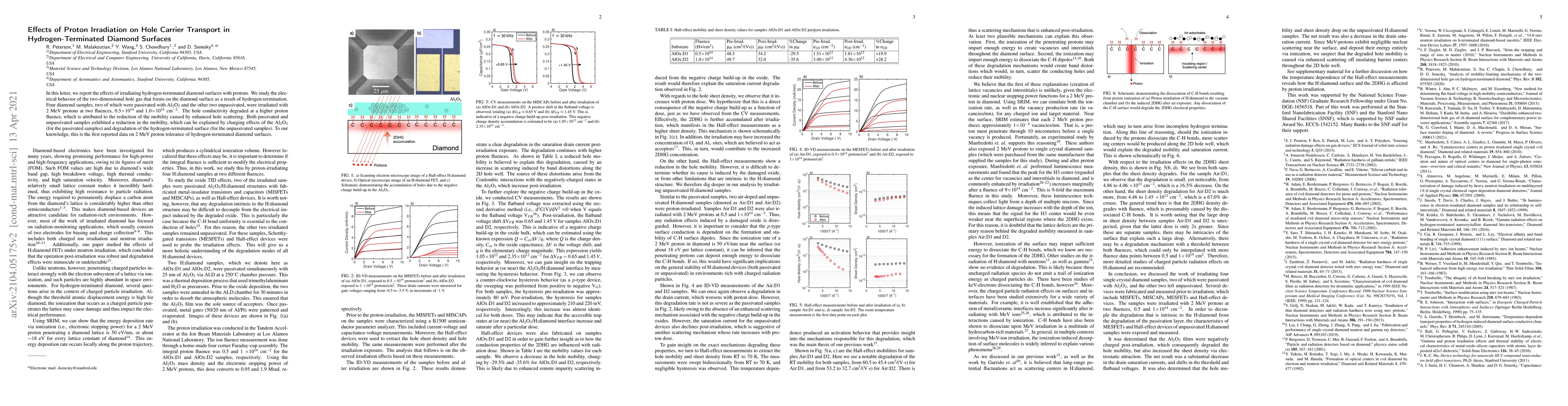 This study investigates the effects of proton irradiation on hole carrier transport in hydrogen-terminated diamond surfaces, revealing that increased proton fluence leads to reduced hole conductivity and mobility due to enhanced scattering and charging/surface degradation effects. The first reported data on 2 MeV proton tolerance in such surfaces is presented.