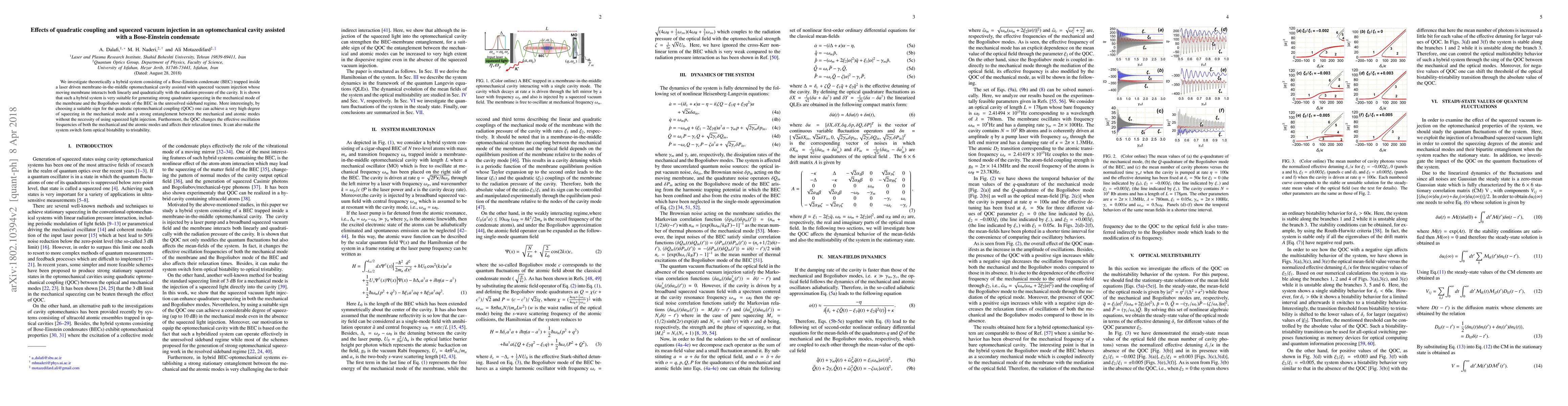 This paper explores a hybrid optomechanical system with a Bose-Einstein condensate, demonstrating strong quadrature squeezing in the mechanical mode via quadratic optomechanical coupling and squeezed vacuum injection. The study reveals that the quadratic coupling can enhance squeezing and entanglement without squeezed light, and it alters the oscillation frequencies and relaxation times of the mechanical and atomic modes, potentially enabling optical bistability to tristability.