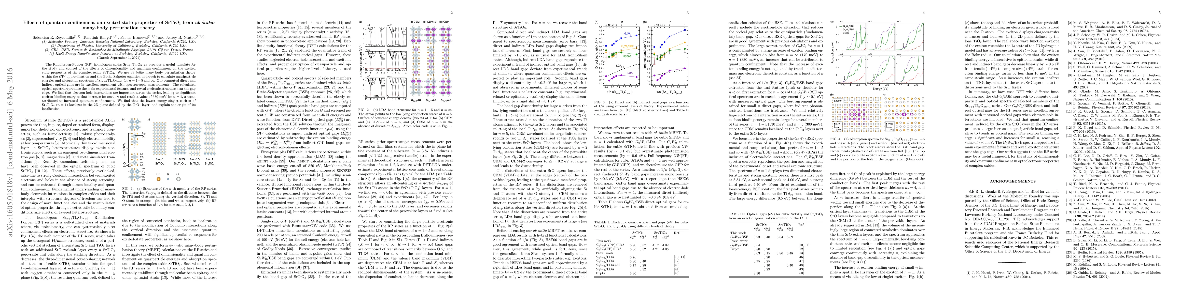 This paper investigates the impact of quantum confinement on the excited state properties of SrTiO$_3$ using ab initio many-body perturbation theory. It finds that exciton binding energies increase significantly with reduced dimensionality, reaching 330 meV for $n=1$, due to enhanced quantum confinement effects.