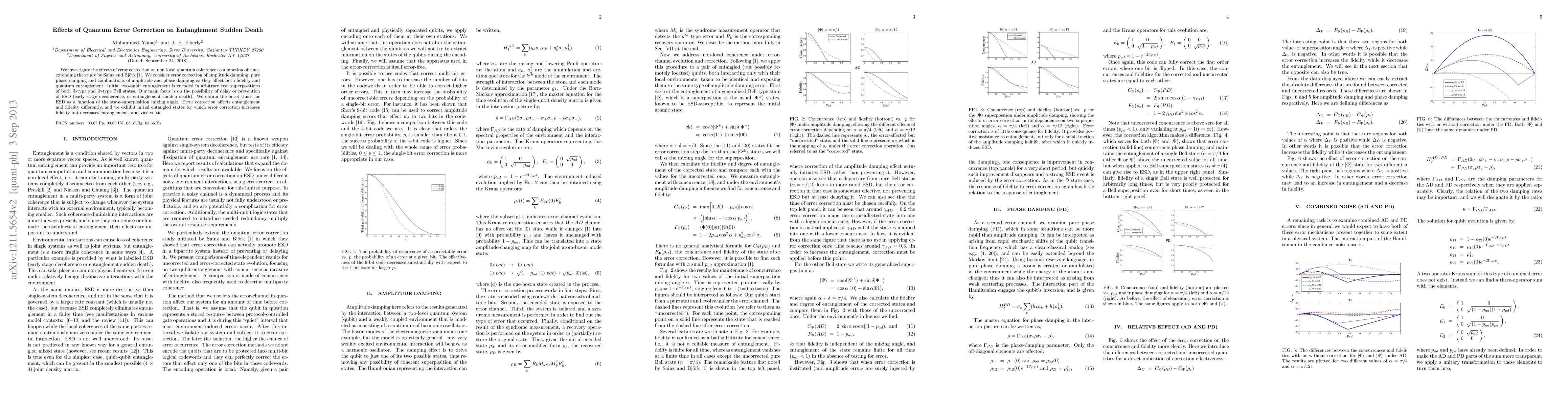 We investigate the effects of error correction on non-local quantum coherence as a function of time, extending the study by Sainz and Bj\"ork. We consider error correction of amplitude damping, pure phase damping and combinations of amplitude and phase damping as they affect both fidelity and quantum entanglement. Initial two-qubit entanglement is encoded in arbitrary real superpositions of both \Phi-type and \Psi-type Bell states. Our main focus is on the possibility of delay or prevention of ESD (early stage decoherence, or entanglement sudden death). We obtain the onset times for ESD as a function of the state-superposition mixing angle. Error correction affects entanglement and fidelity differently, and we exhibit initial entangled states for which error correction increases fidelity but decreases entanglement, and vice versa.